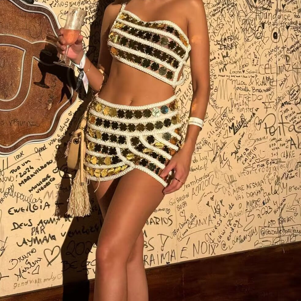 Crafted to perfection. this dazzling dress features a striking array of mirrored discs meticulously arranged to create a shimmering mosaic effect. Each disc reflects light with a radiant brilliance. casting a golden glow that captivates all who behold it.