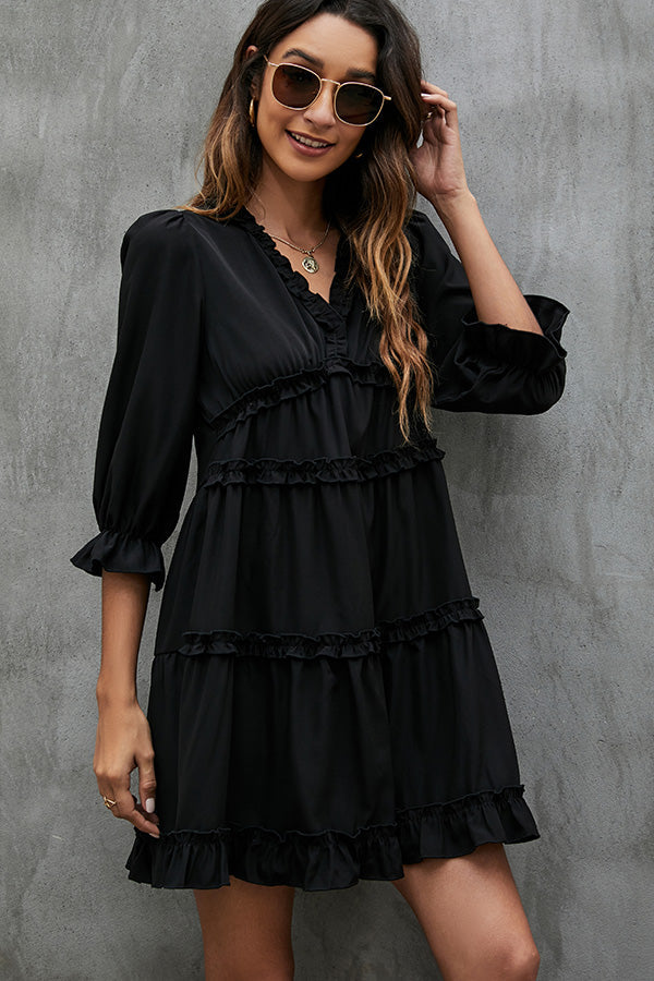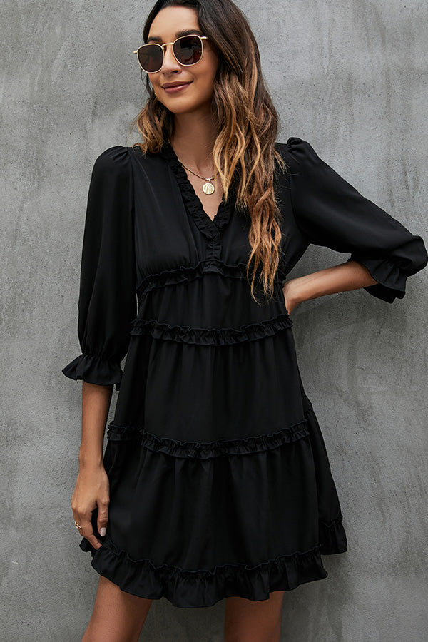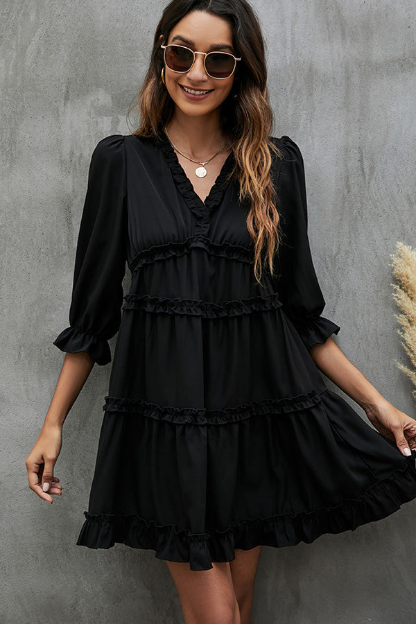 Solid Black and Ruffled V Neck Mini Dress