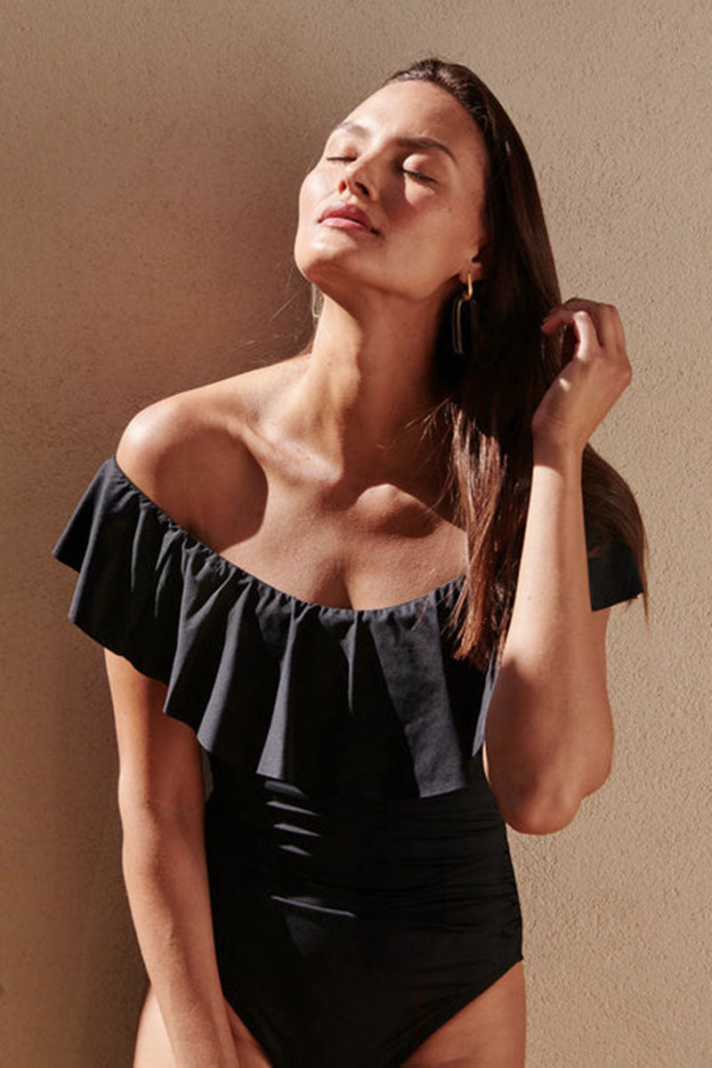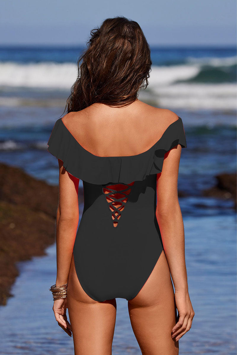 Black Ruffle Off Shoulder Glamorous Strappy One Piece Swimwear