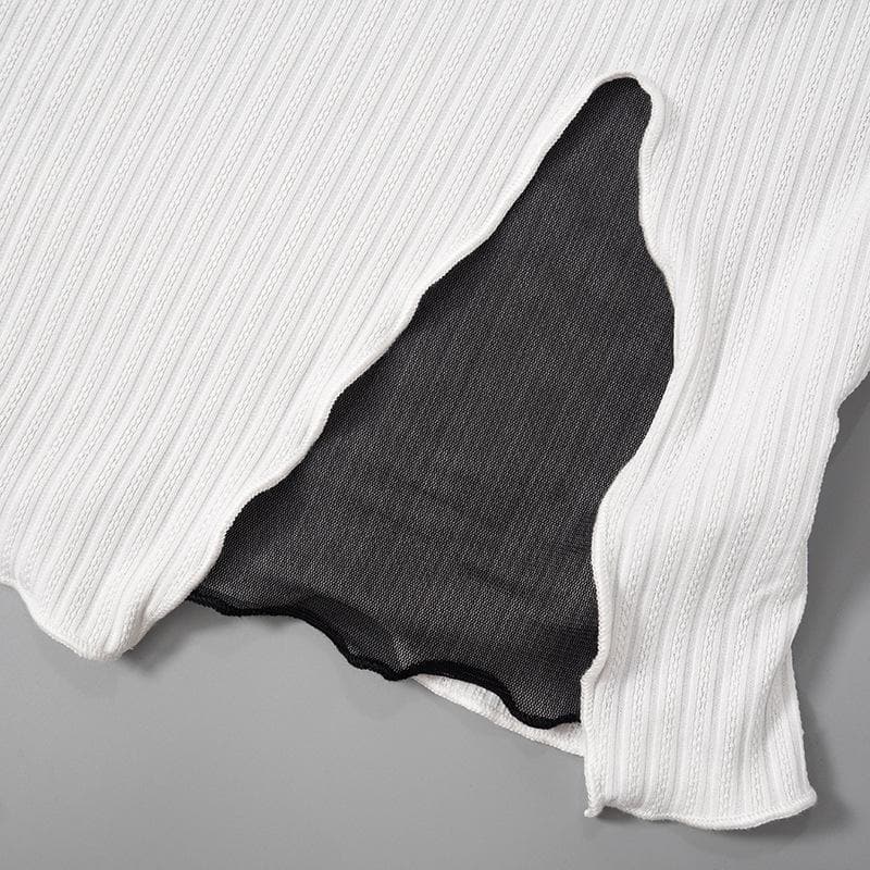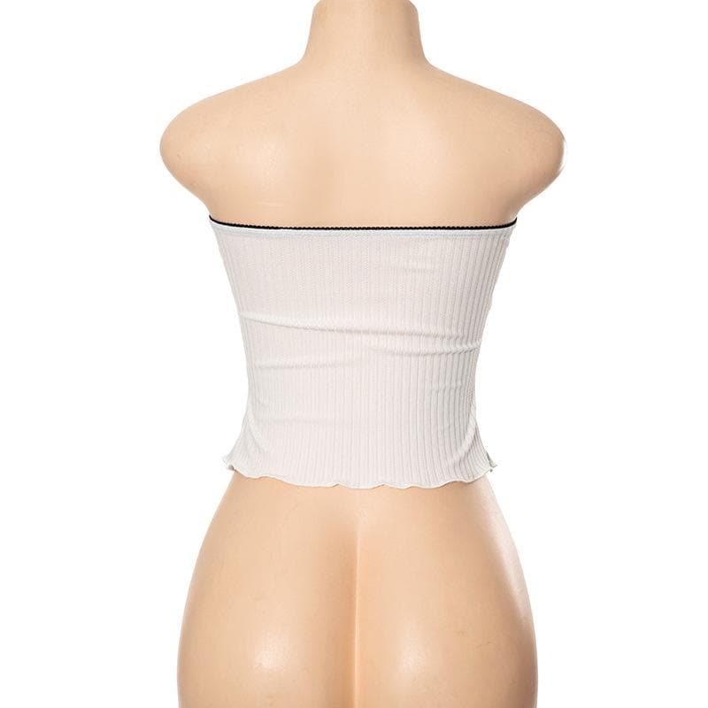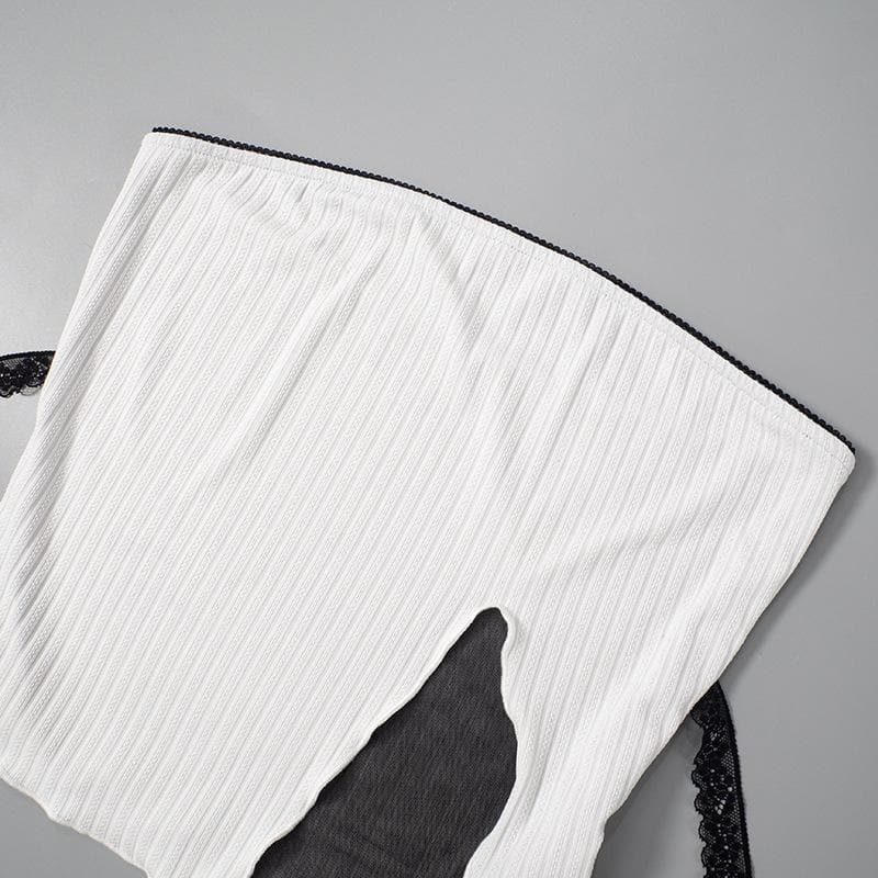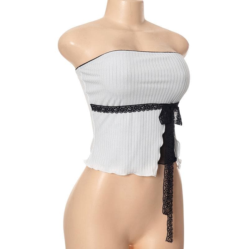 Bowknot lace hem ribbed patchwork slit backless ruffle tube top