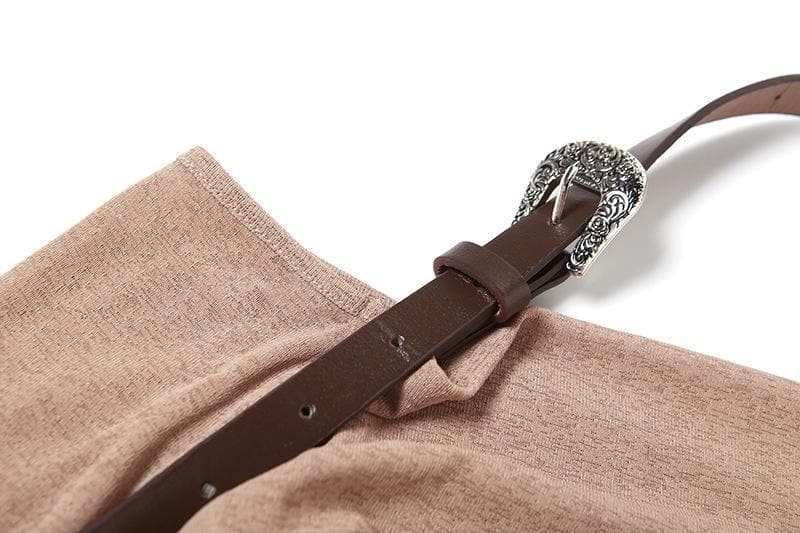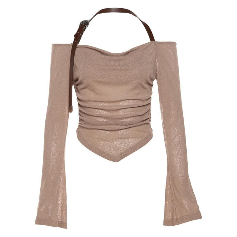 Buckle halter PU leather cowl neck off shoulder long sleeve top