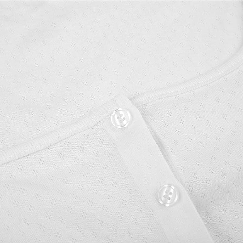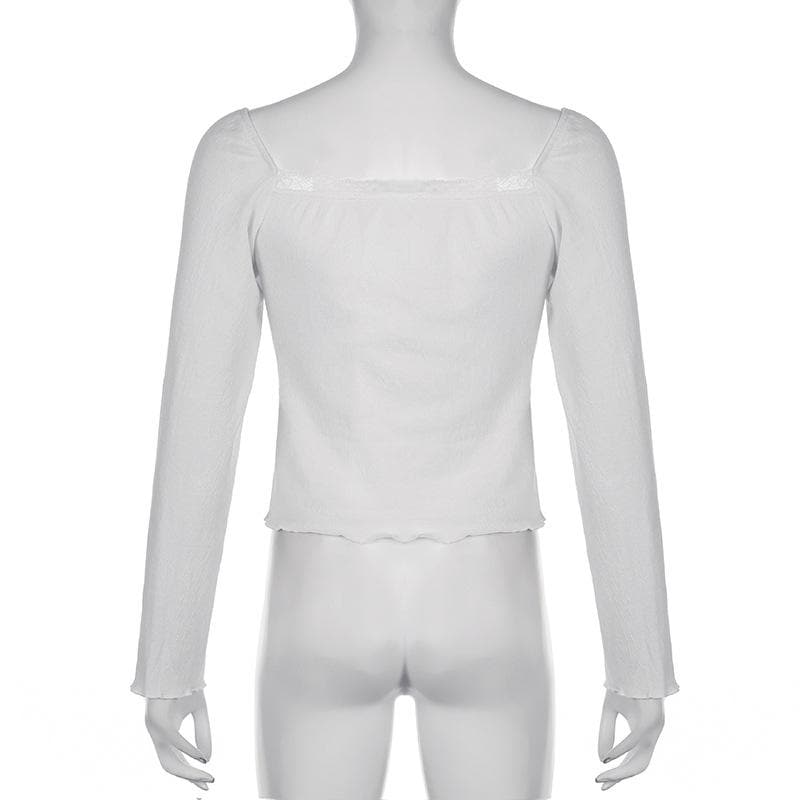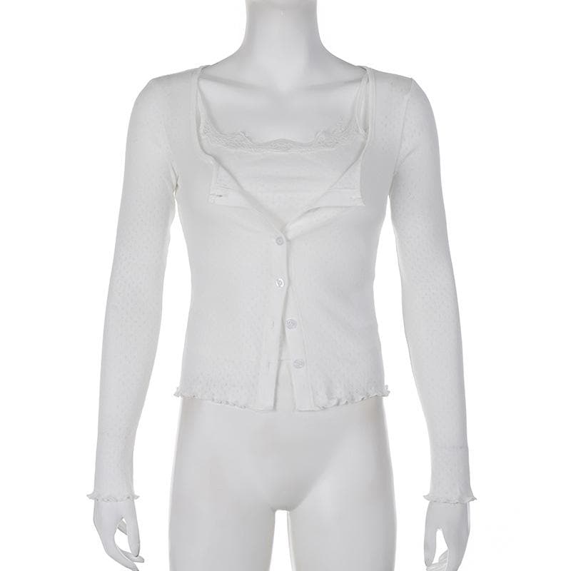 Button ruffle long sleeve lace hem textured solid 2 piece top