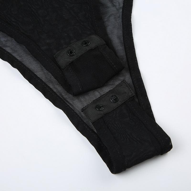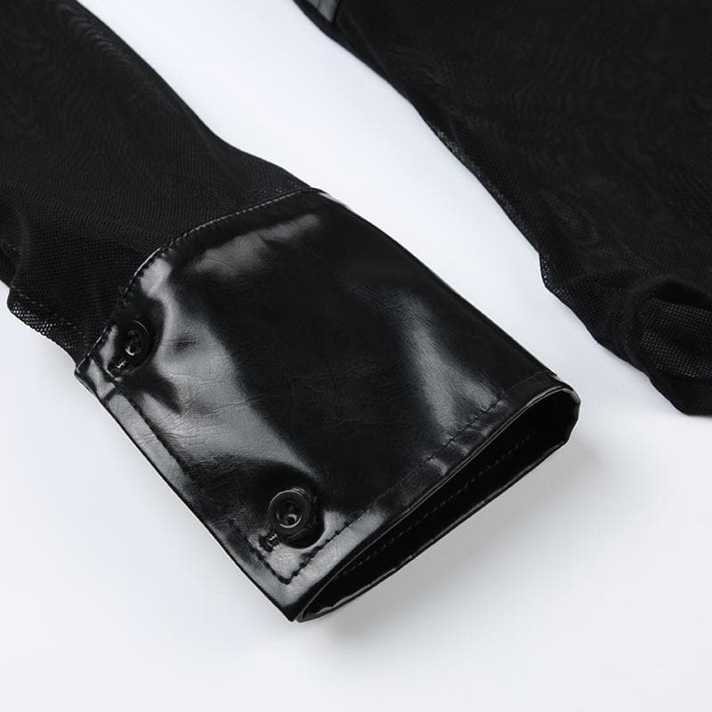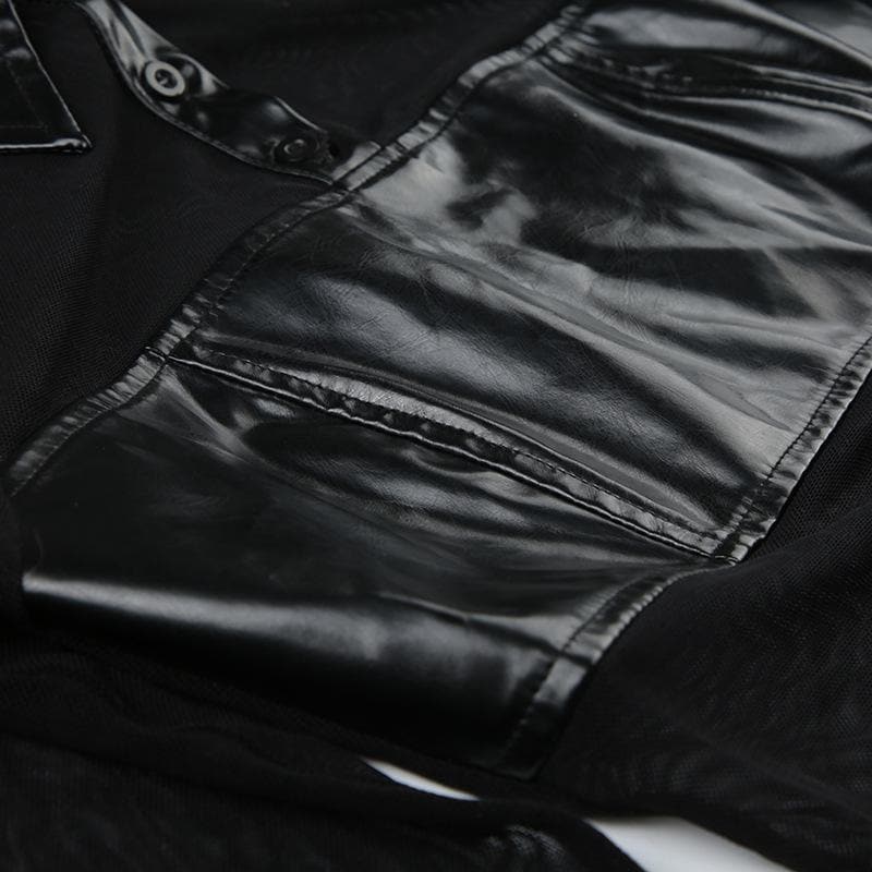 Button turnover collar mesh long flared sleeve PU leather bodysuit