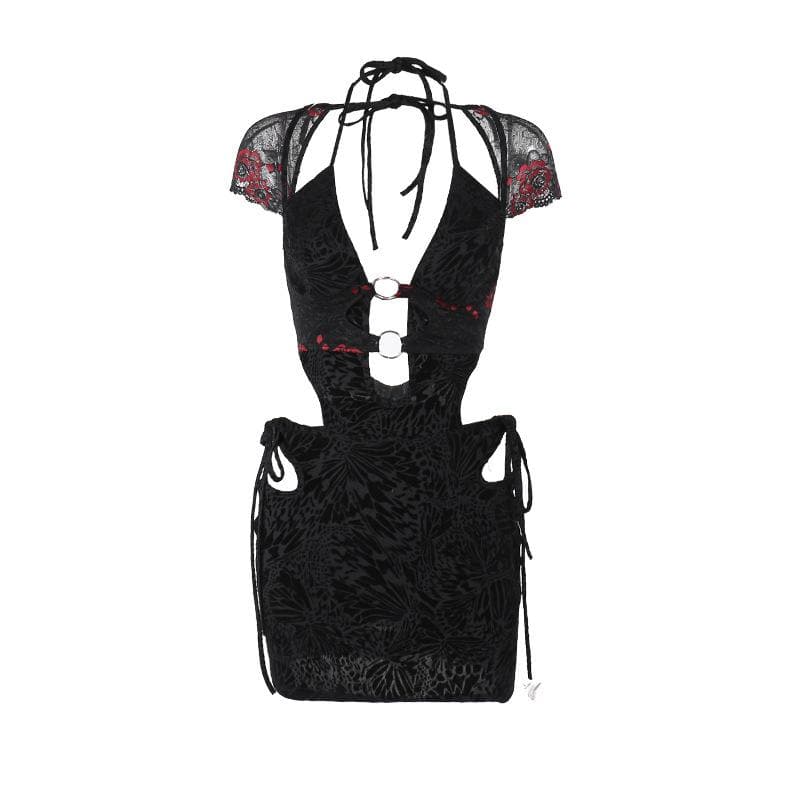 Cap sleeve halter o ring deep V neck hollow out lace mini dress