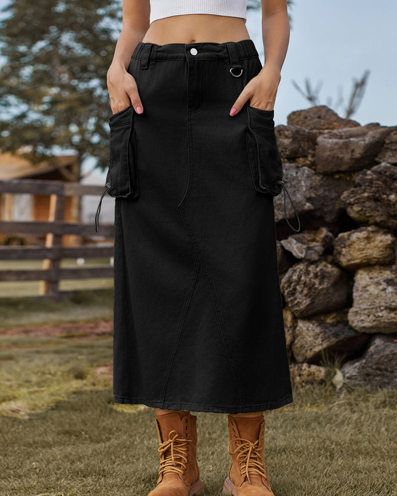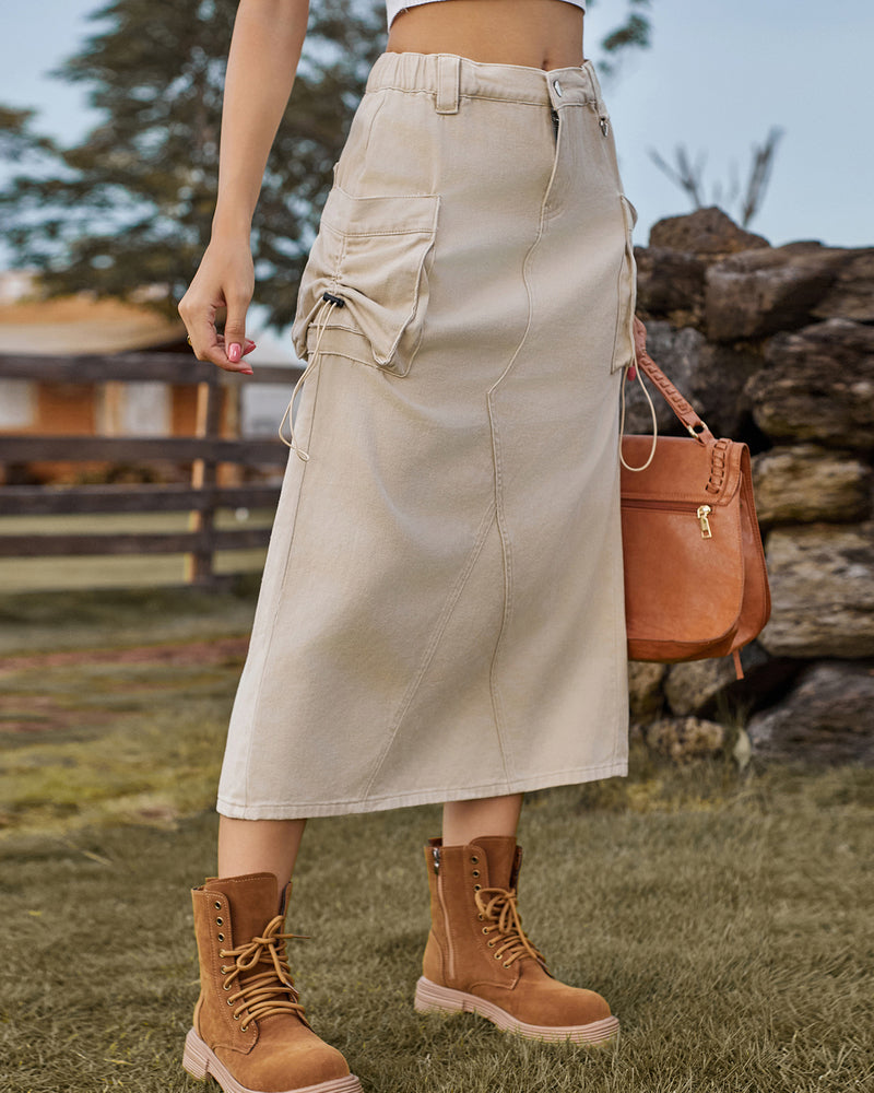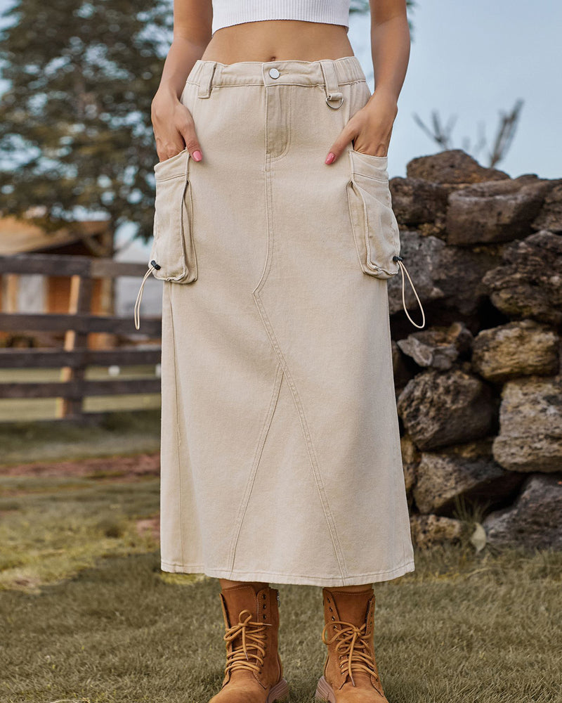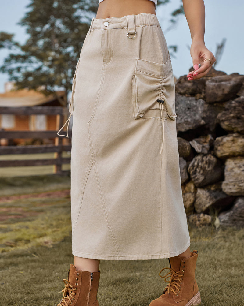 This is a mid-length denim skirt with a vintage-inspired. workwear aesthetic. It is designed to be casual and comfortable. perfect for relaxed occasions. The skirt features a classic half-length cut and has drawstring pockets on both sides. adding a unique and functional detail.