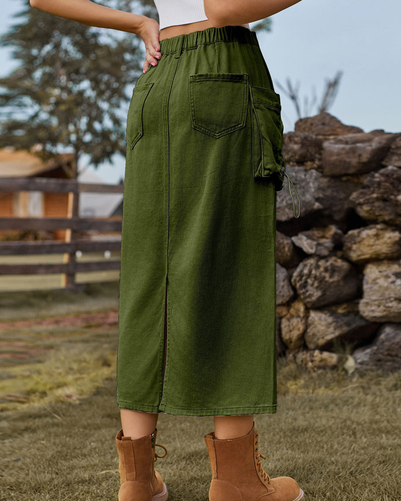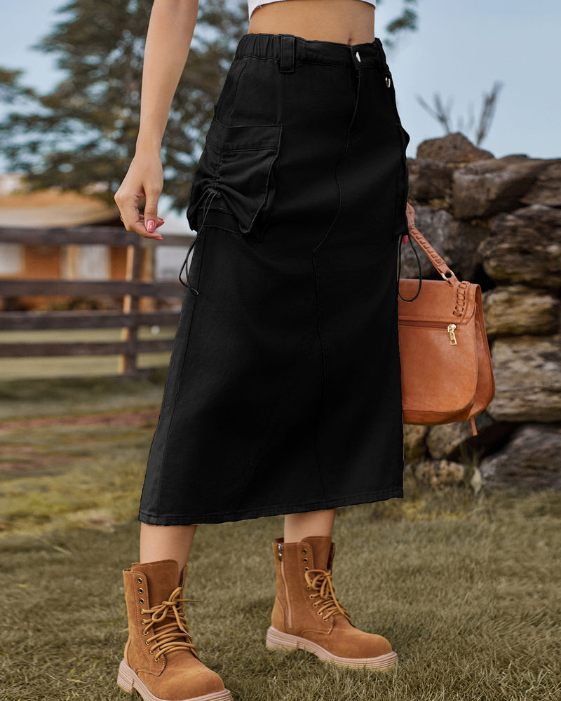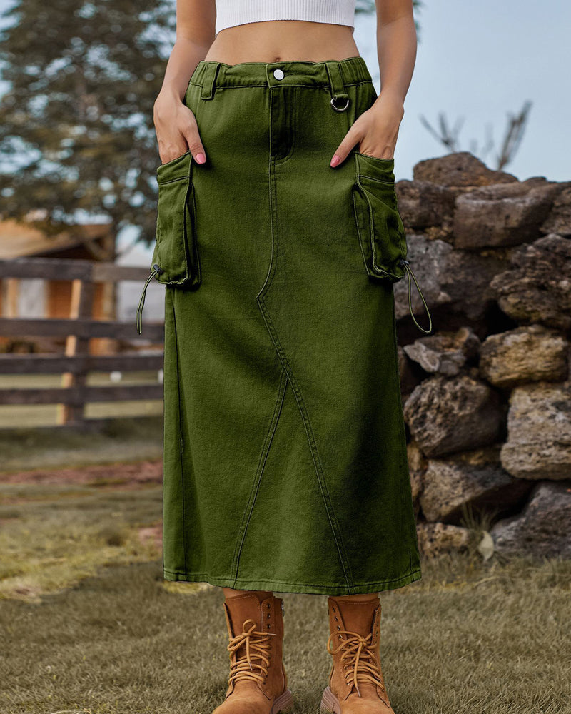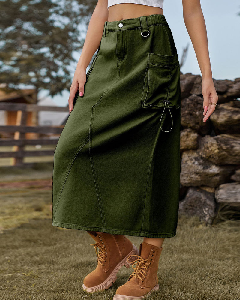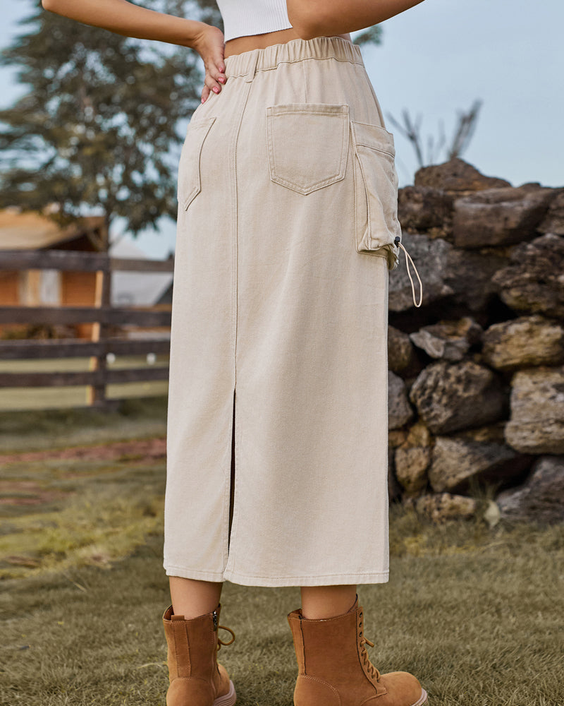 This is a mid-length denim skirt with a vintage-inspired. workwear aesthetic. It is designed to be casual and comfortable. perfect for relaxed occasions. The skirt features a classic half-length cut and has drawstring pockets on both sides. adding a unique and functional detail.