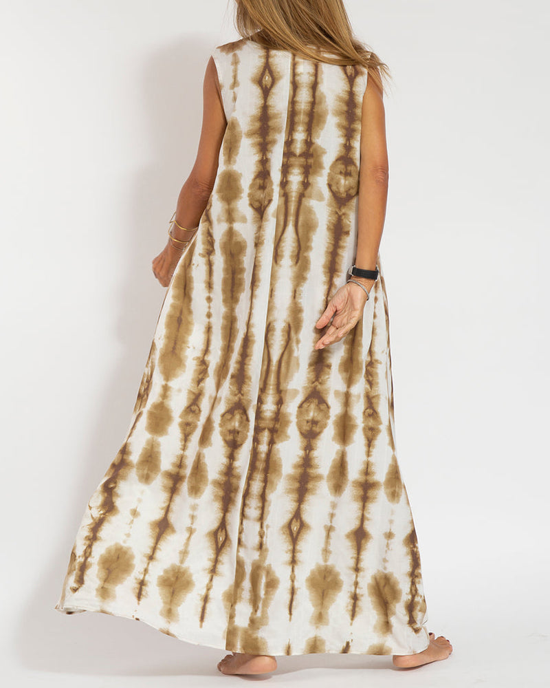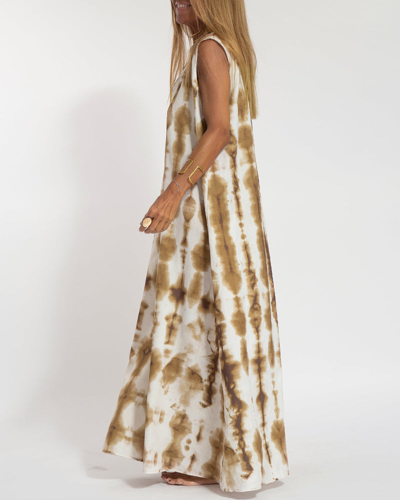 Casual Sleeveless Dress Loose V Neck Tie-dye Beach Maxi Long Dress