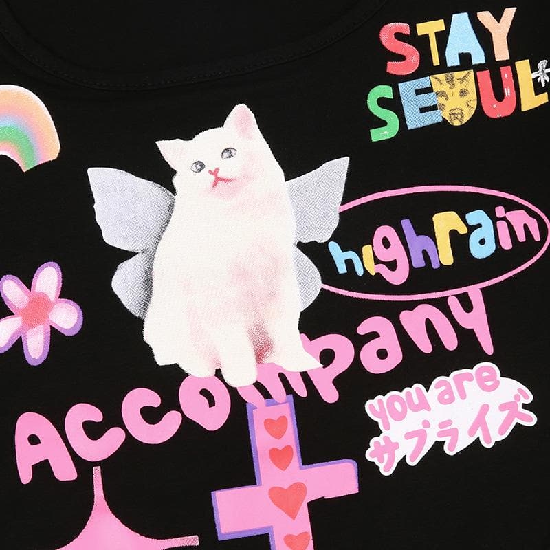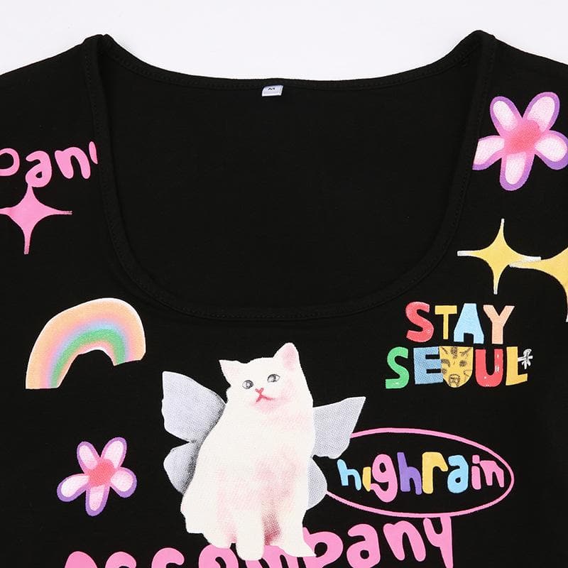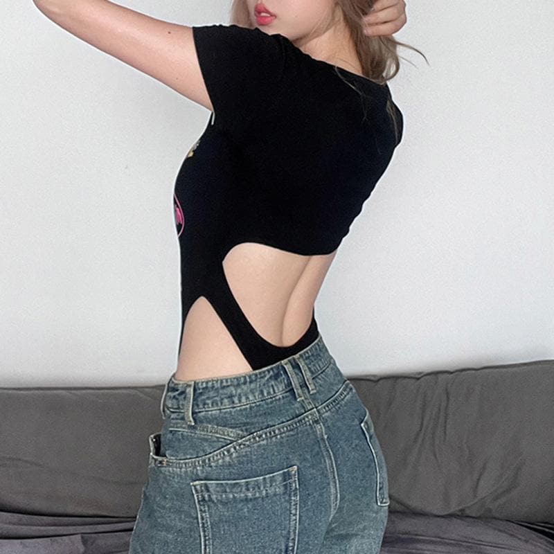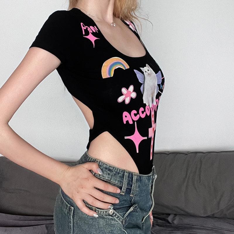 Cat pattern contrast short sleeve u neck hollow out bodysuit