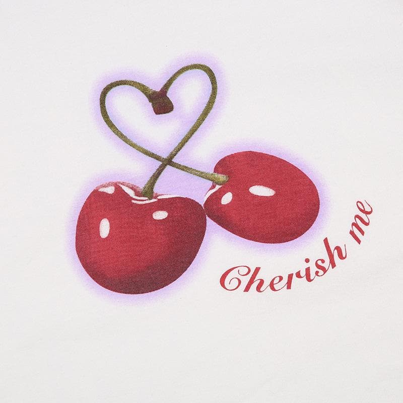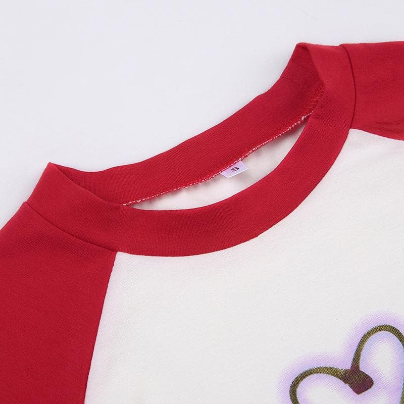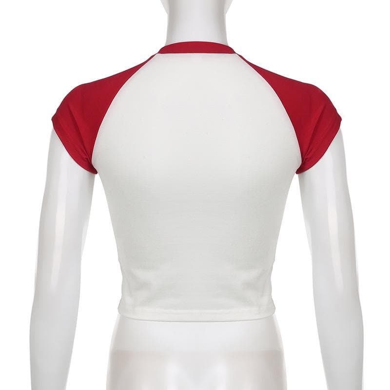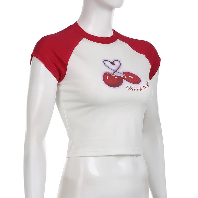 Cherry pattern patchwork contrast cap sleeve crewneck crop top