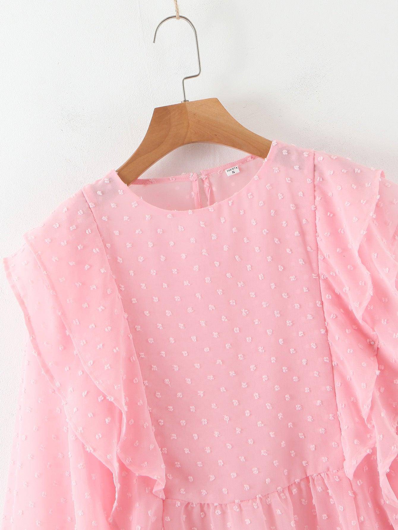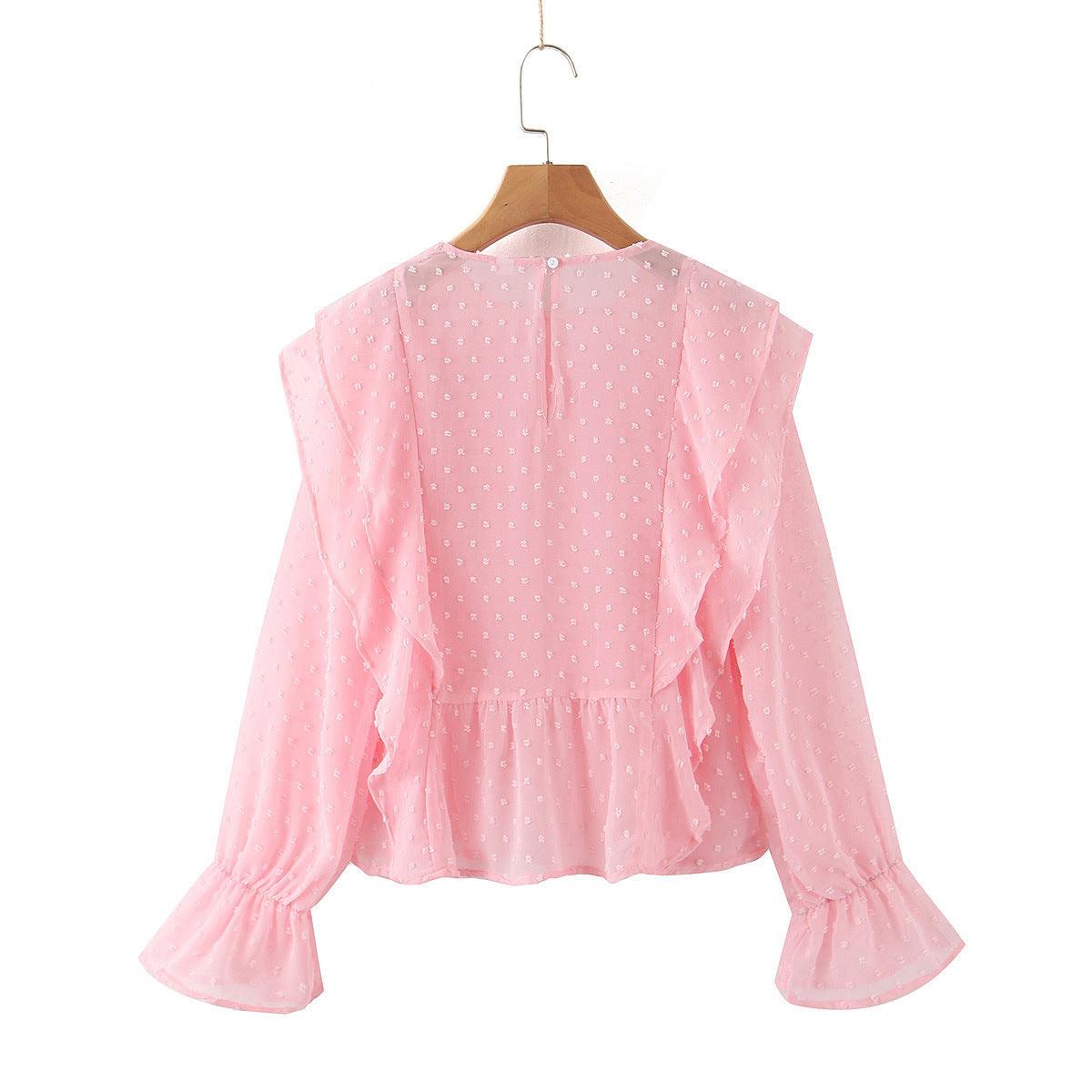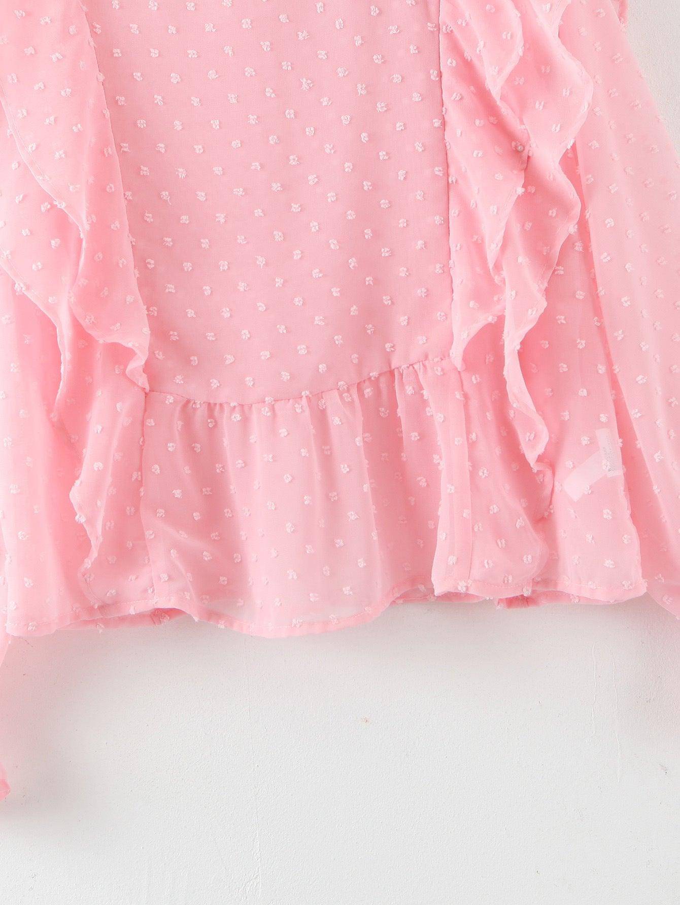 Claire Dobby Mesh Flounce Sleeves Ruffle Blouse