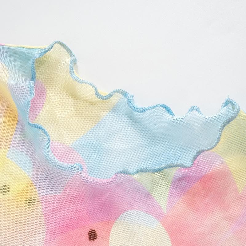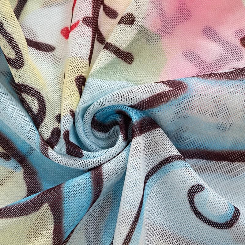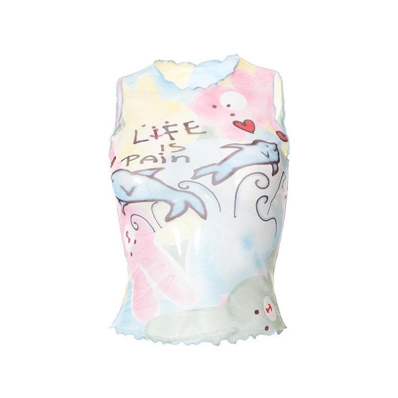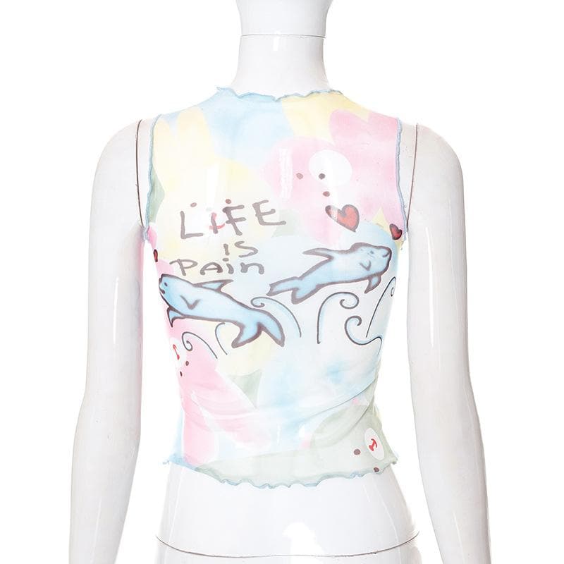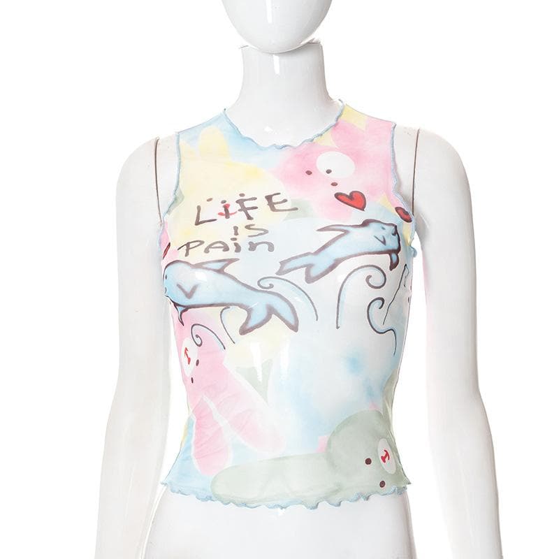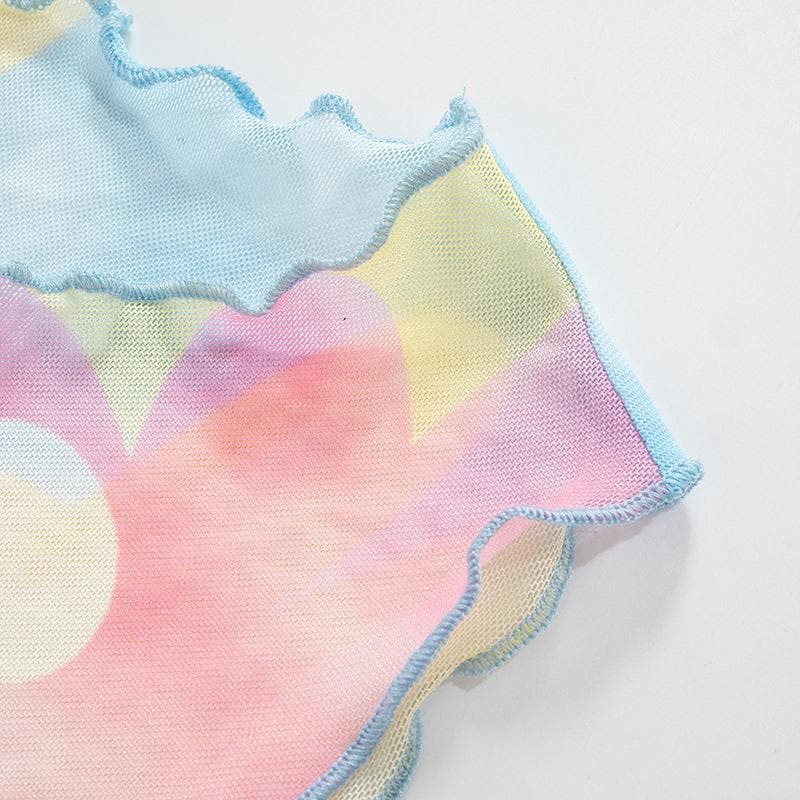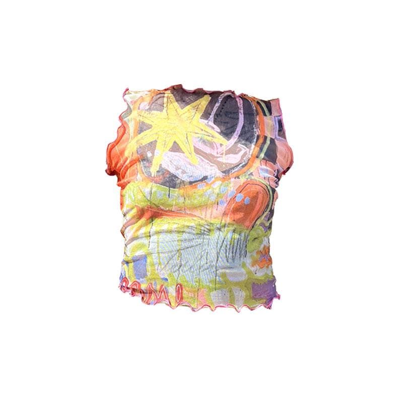 Contrast print ruffle sheer mesh see through sleeveless top