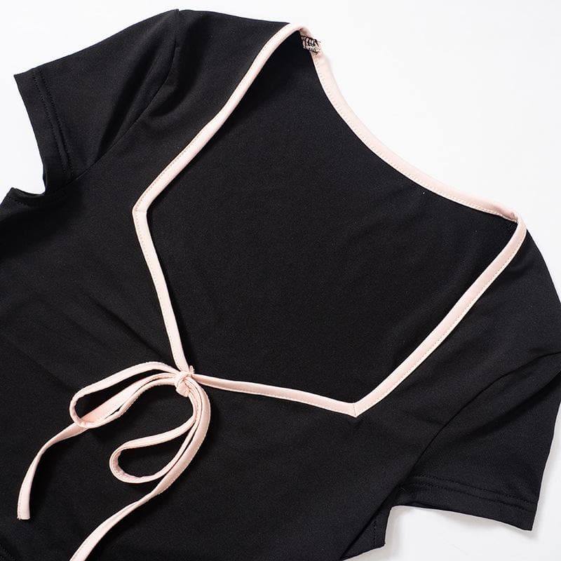 Contrast self tie v neck short sleeve crop top