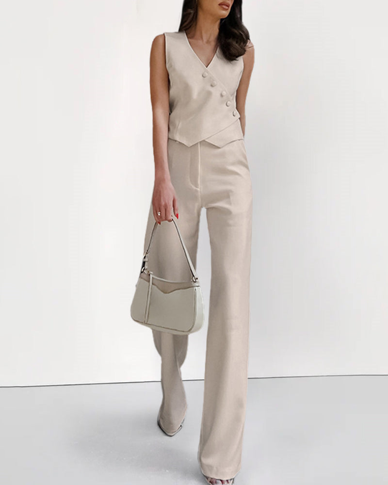 Cotton Linen Vest Wide-leg Pants Two-piece Set Summer Slanted Buckle Design Suit