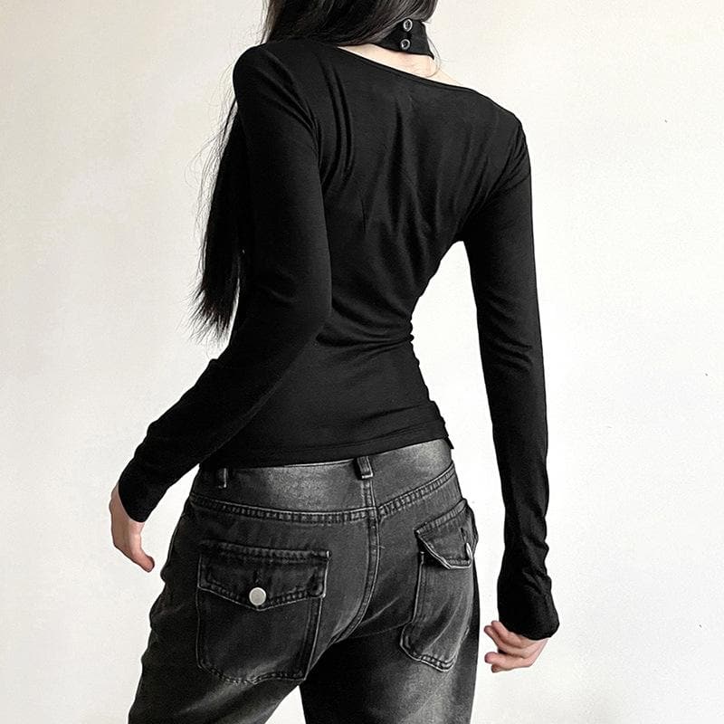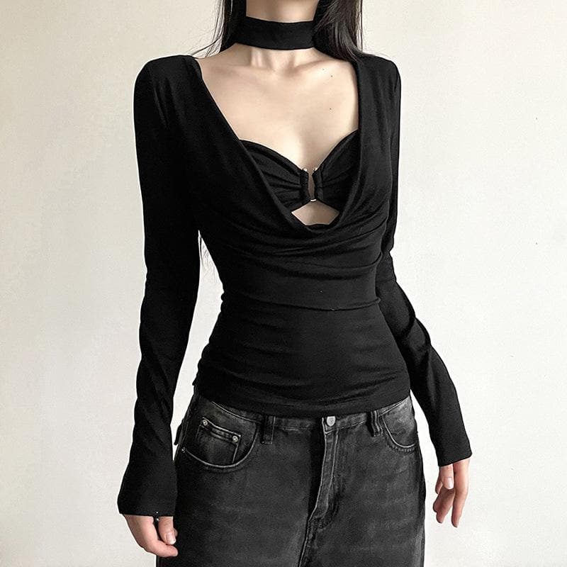 Cowl neck solid long sleeve ruched choker 2 piece cami top
