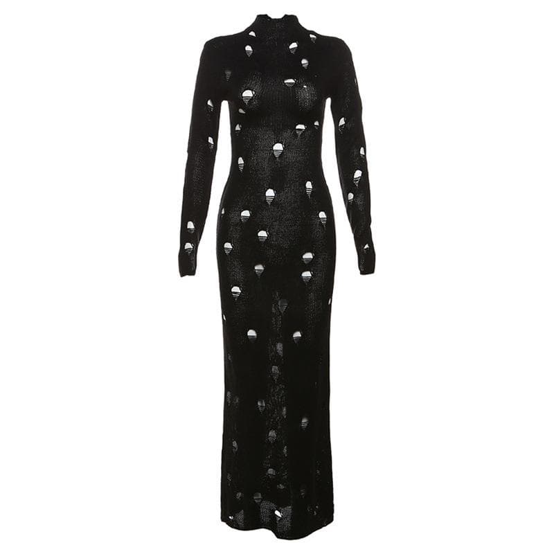 Crochet solid long sleeve high neck lace up maxi dress