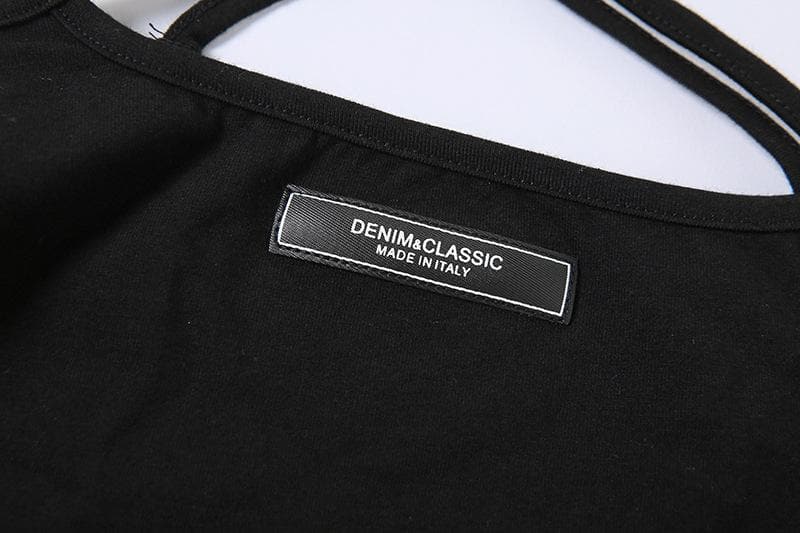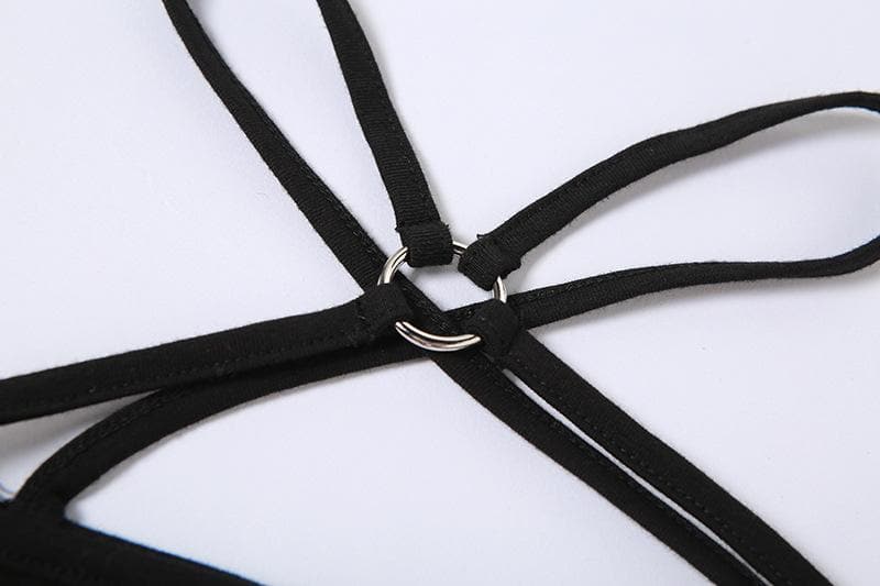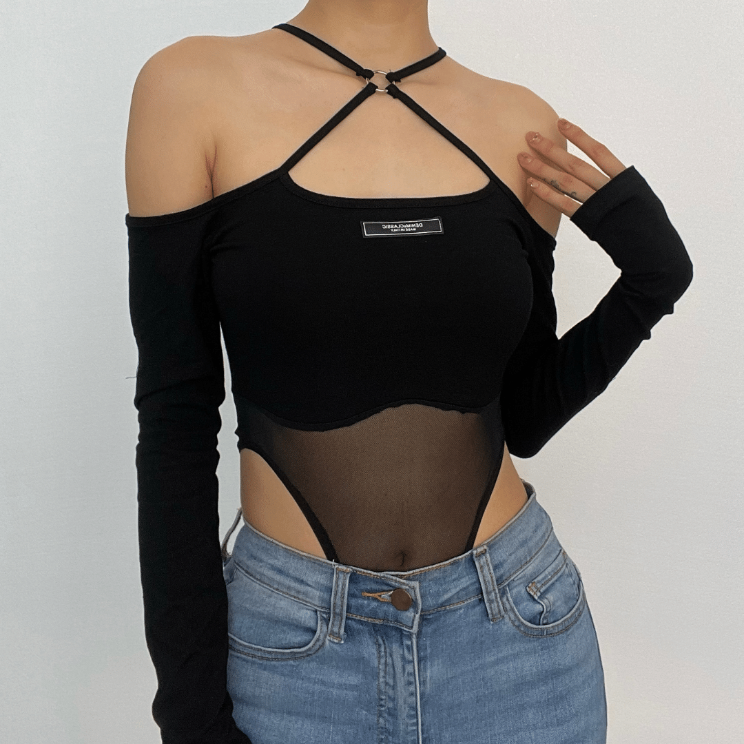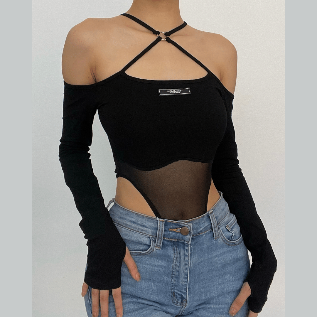 Cross front off shoulder solid mesh o ring gloves bodysuit
