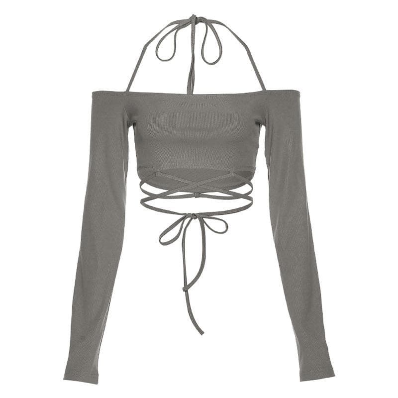 Cross front solid halter off shoulder self tie long sleeve crop top