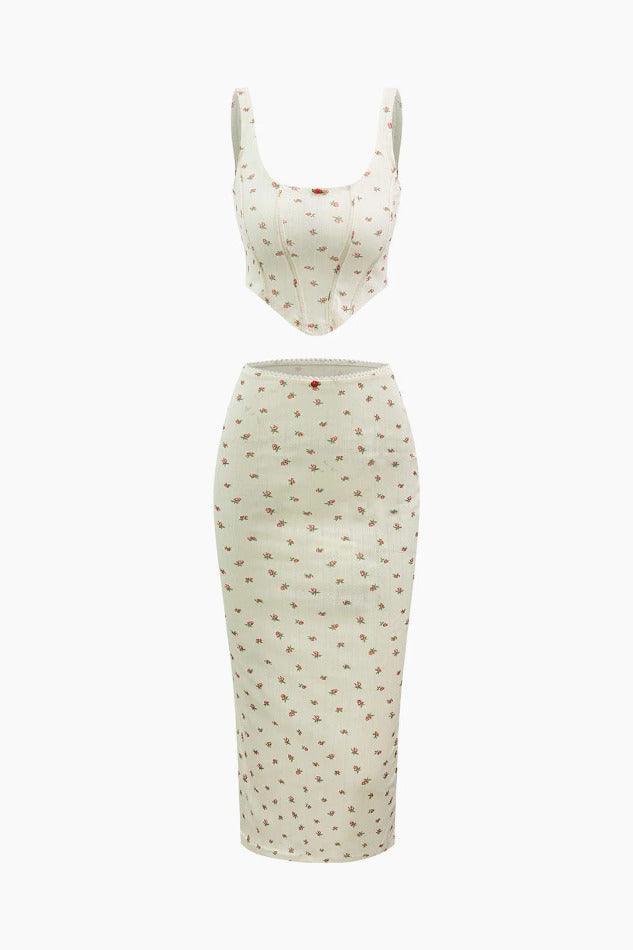 Ditsy Rose Square Neck Corset Top And Midi Skirt Set