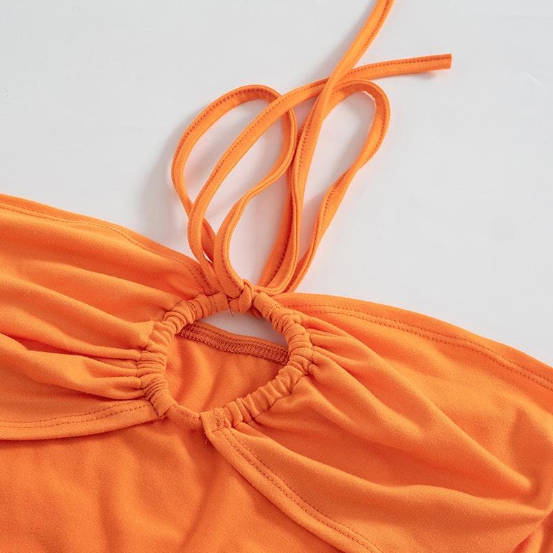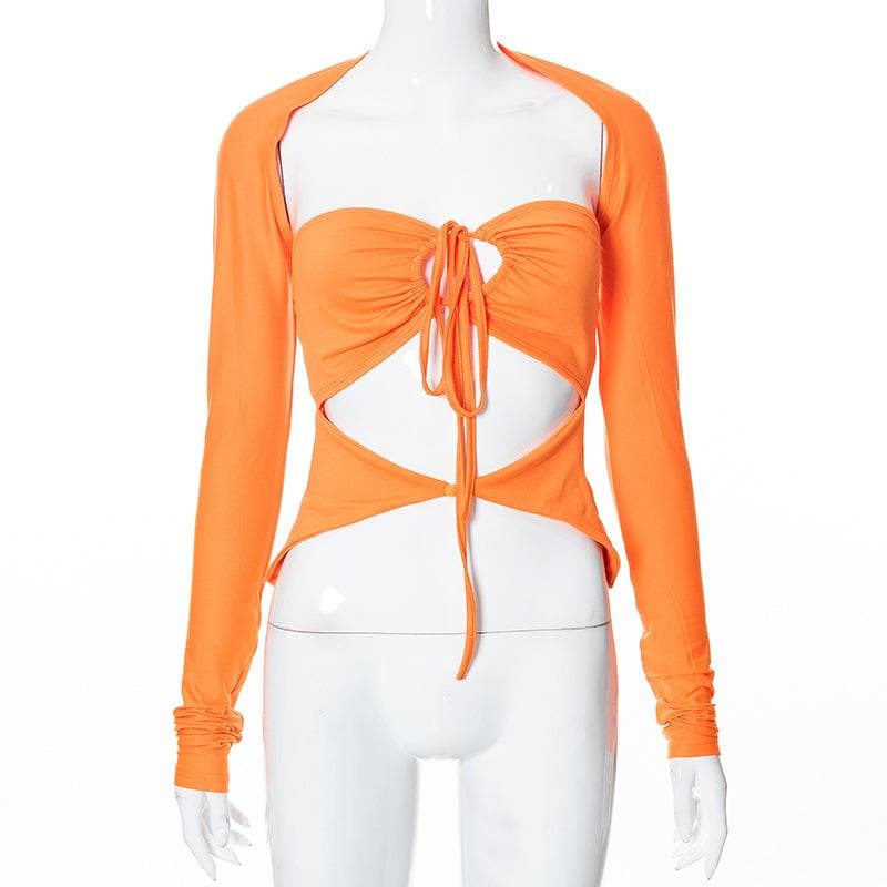 Drawstring hollow out button solid 2 piece shrug tube cut out top