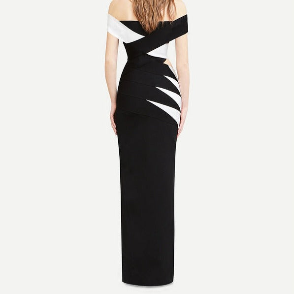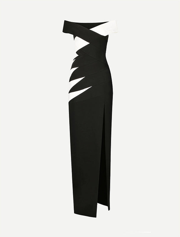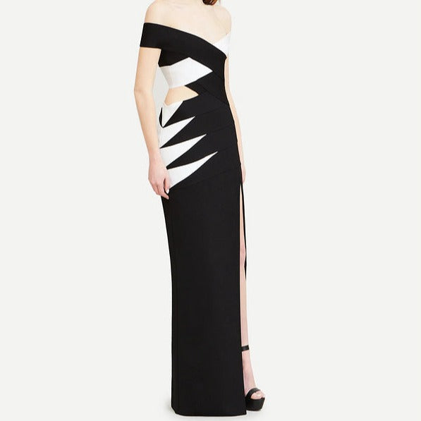 Indulge in timeless elegance with the Elanor Off The Shoulder Side Slit Two-Toned Maxi Dress. a sophisticated ensemble designed to captivate attention at any special occasion. This dress exudes refined grace with its classic silhouette and modern accents. ensuring you make a memorable impression with every step.