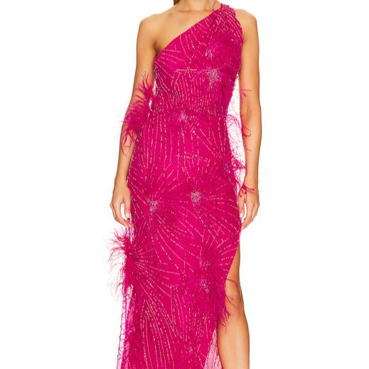 Bold and Beautiful: The combination of a one-shoulder design. rhinestone and sequin embellishments. and a side slit creates a look that is both bold and beautiful. perfect for making a lasting impression.