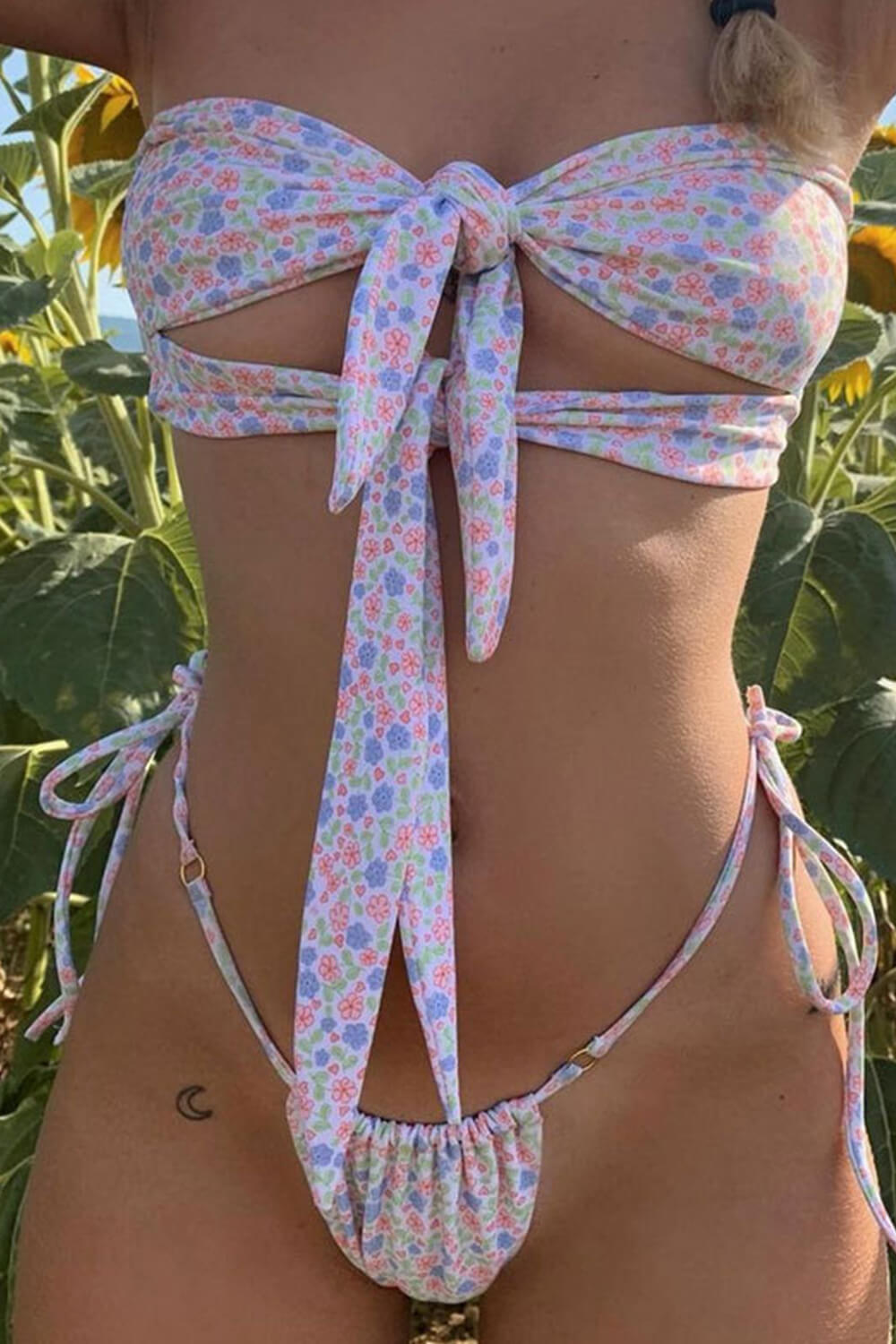 Floral Print Double Front Tie Bandeau Ruched Brazilian Bikini Set