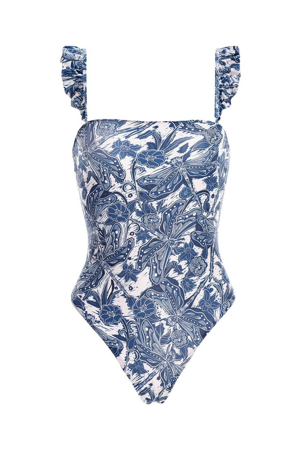 Blue Dragonfly Print Ruffle-Trimmed One Piece Swimsuit