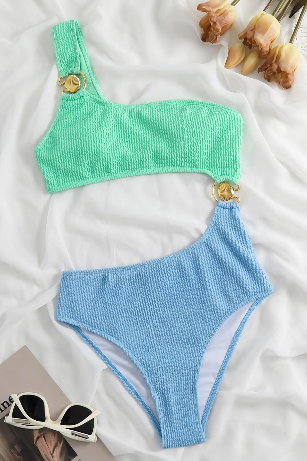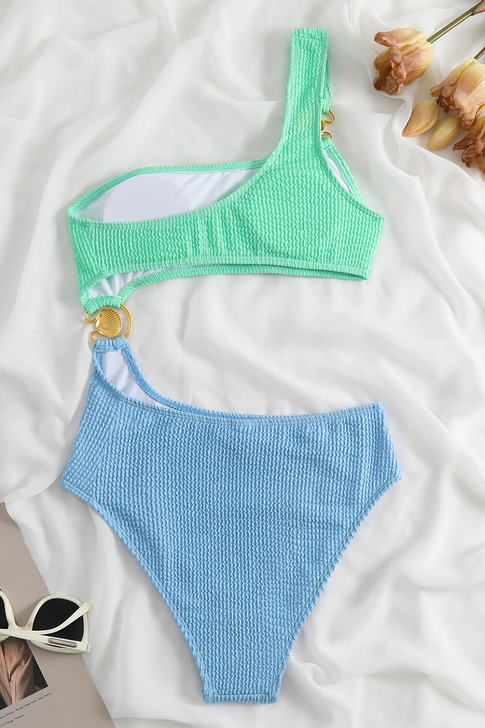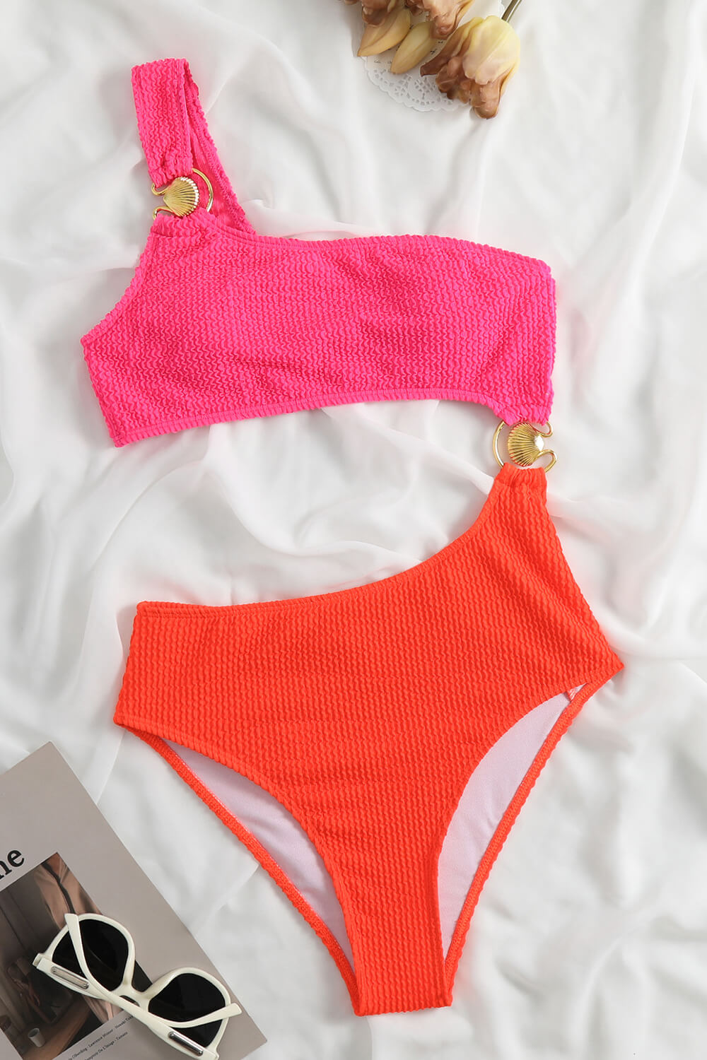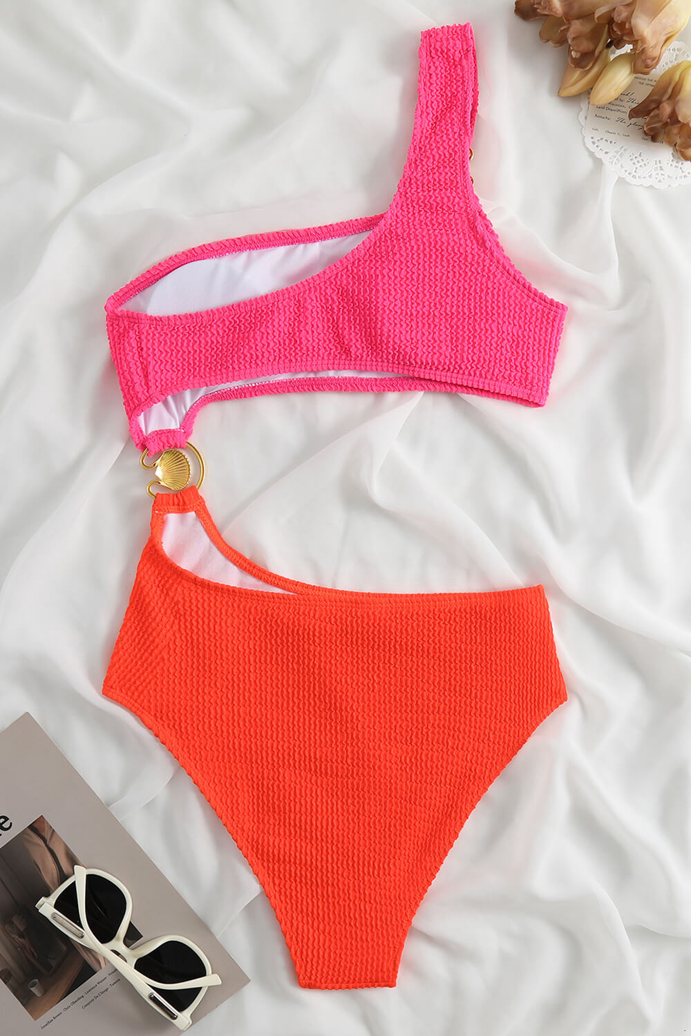 Color Block Crinkle Cut Out One Shoulder One Piece Swimsuit