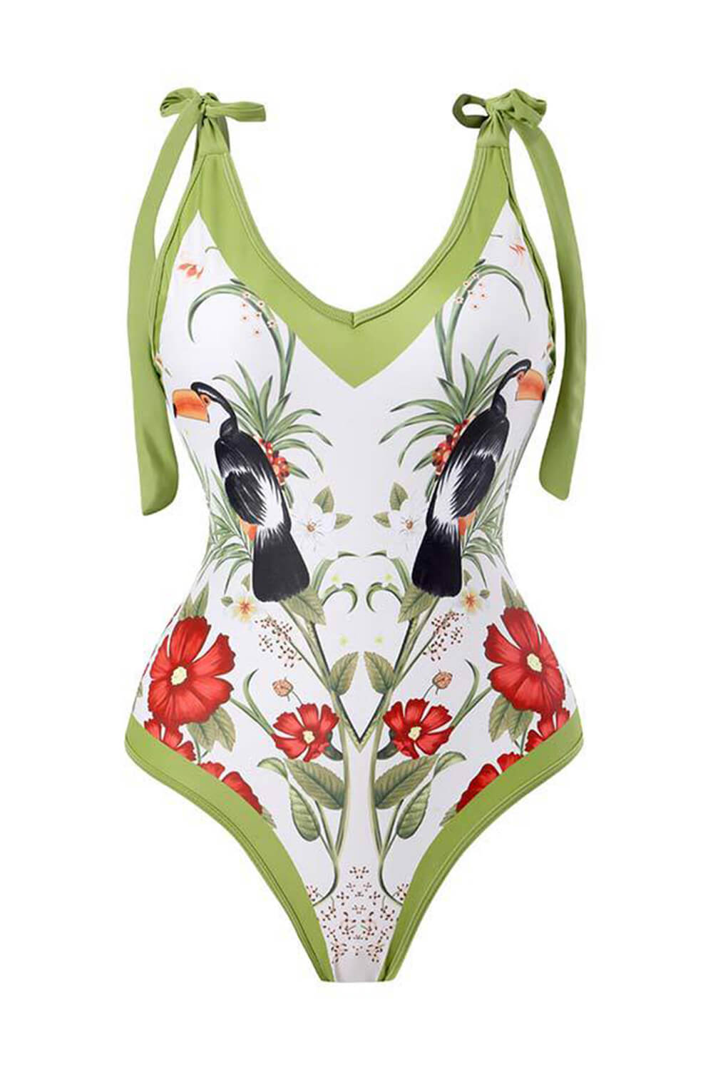 Toco Toucan & Floral Print Plunge Tie-Shoulder One Piece Swimsuit