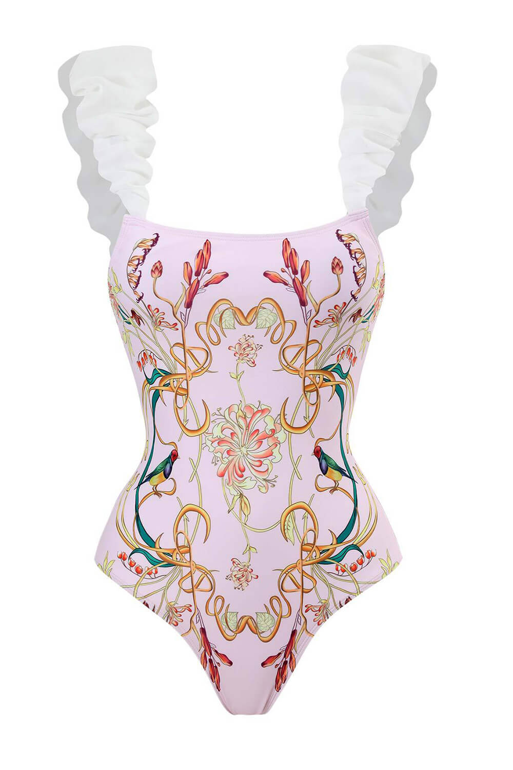 Floral & Birds Print Ruffled Shoulder One Piece Swimsuit