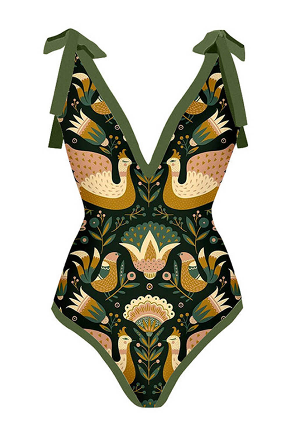Mandarin Duck Print Plunge Tie-Shoulder One Piece Swimsuit