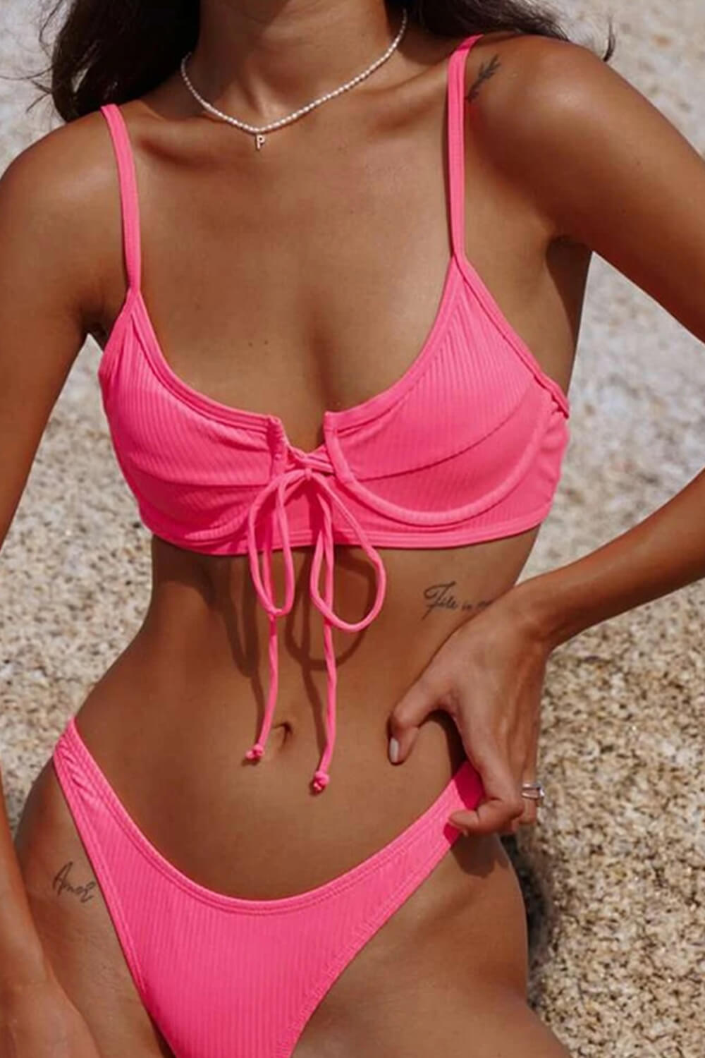 Hot Pink Ribbed Underwired Lace Up Bikini Set