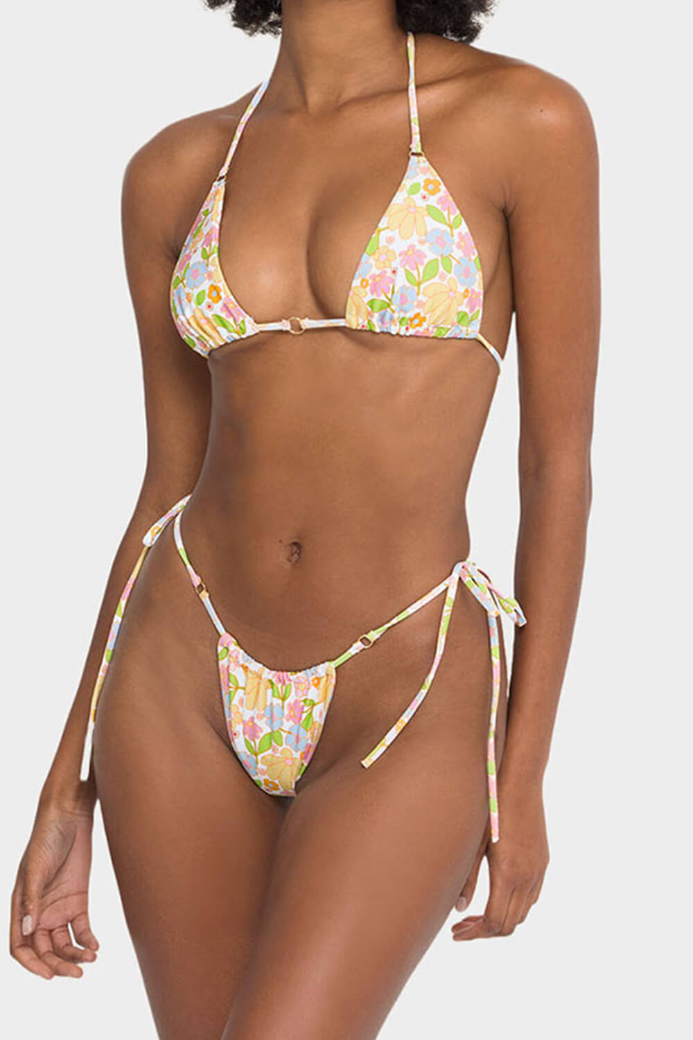 Halter Triangle Tie Side Bikini Set With Ring Detailing - Retro Flowers