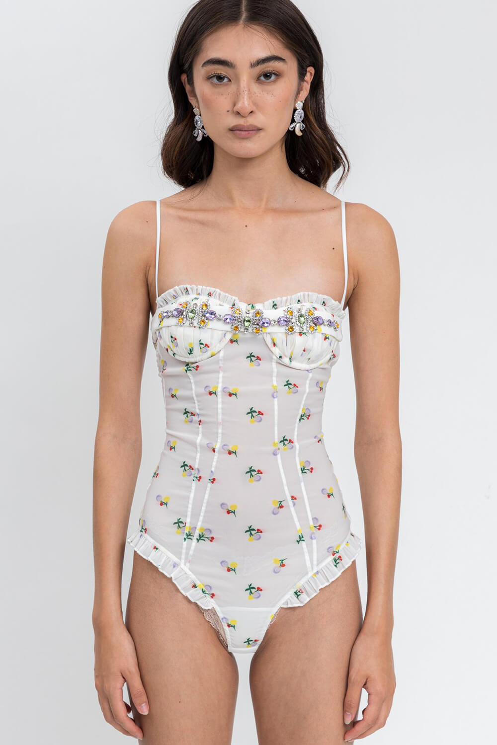Floral-Print Ruffled Trim Ruched Underwire One Piece Swimsuit With Crystal Embroidered Detailing