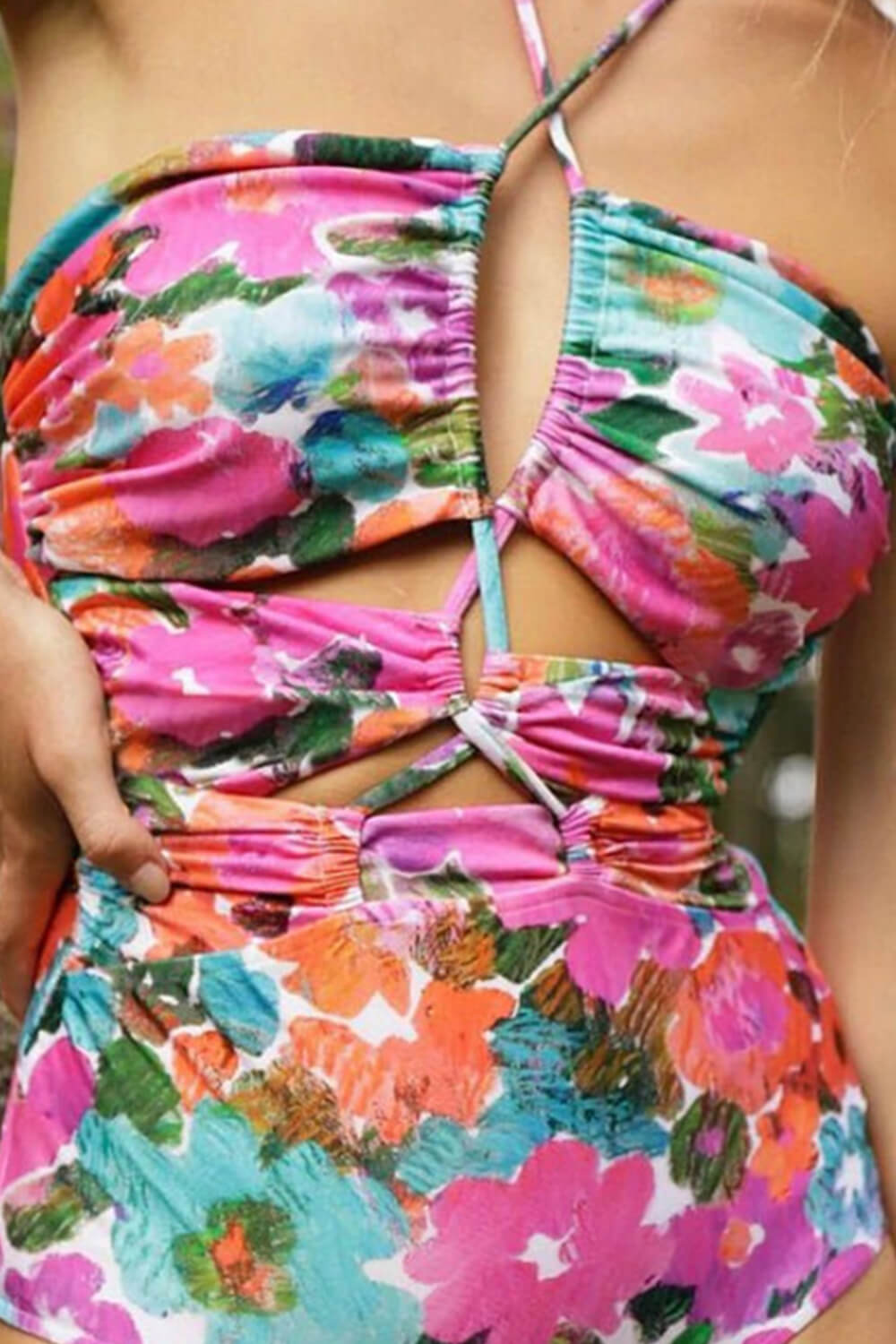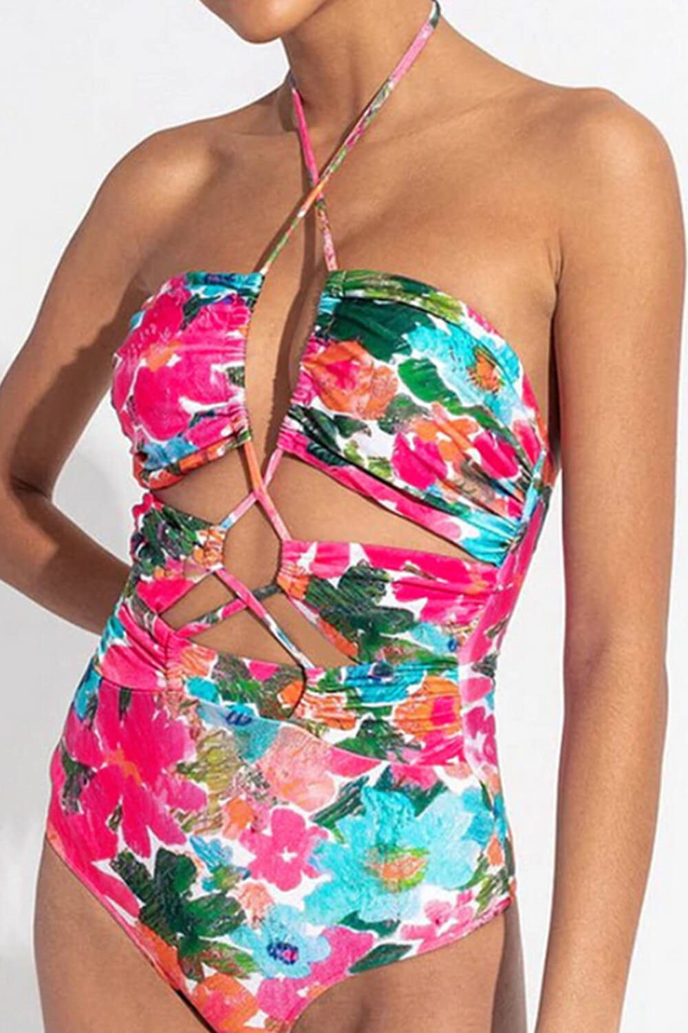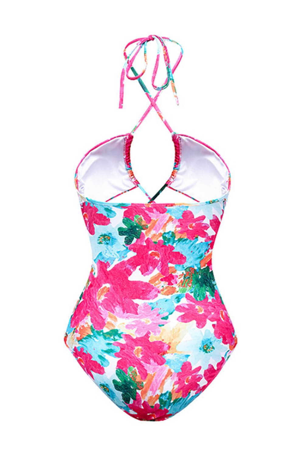 Floral Laceup Crossover Halterneck One Piece Swimsuit