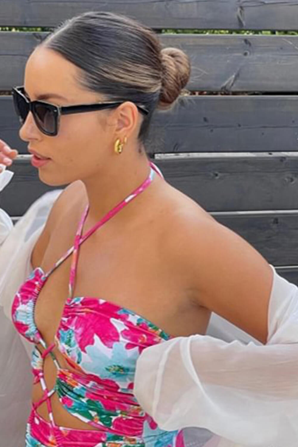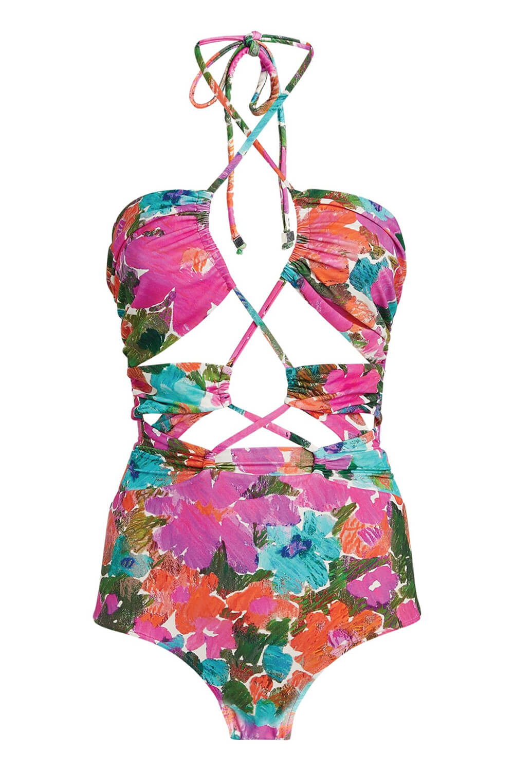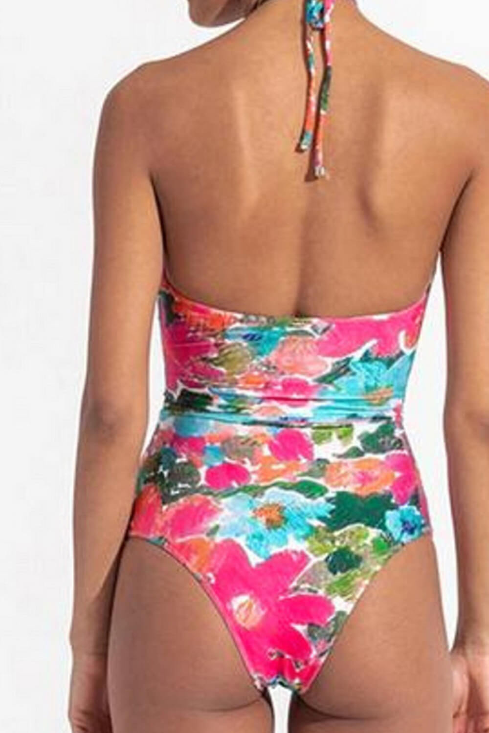 Floral Laceup Crossover Halterneck One Piece Swimsuit