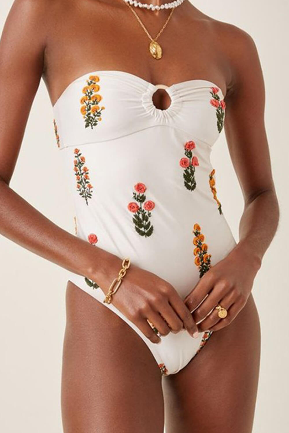 Floral-Embroidered Strapless One Piece Swimsuit With O-Ring Detailing