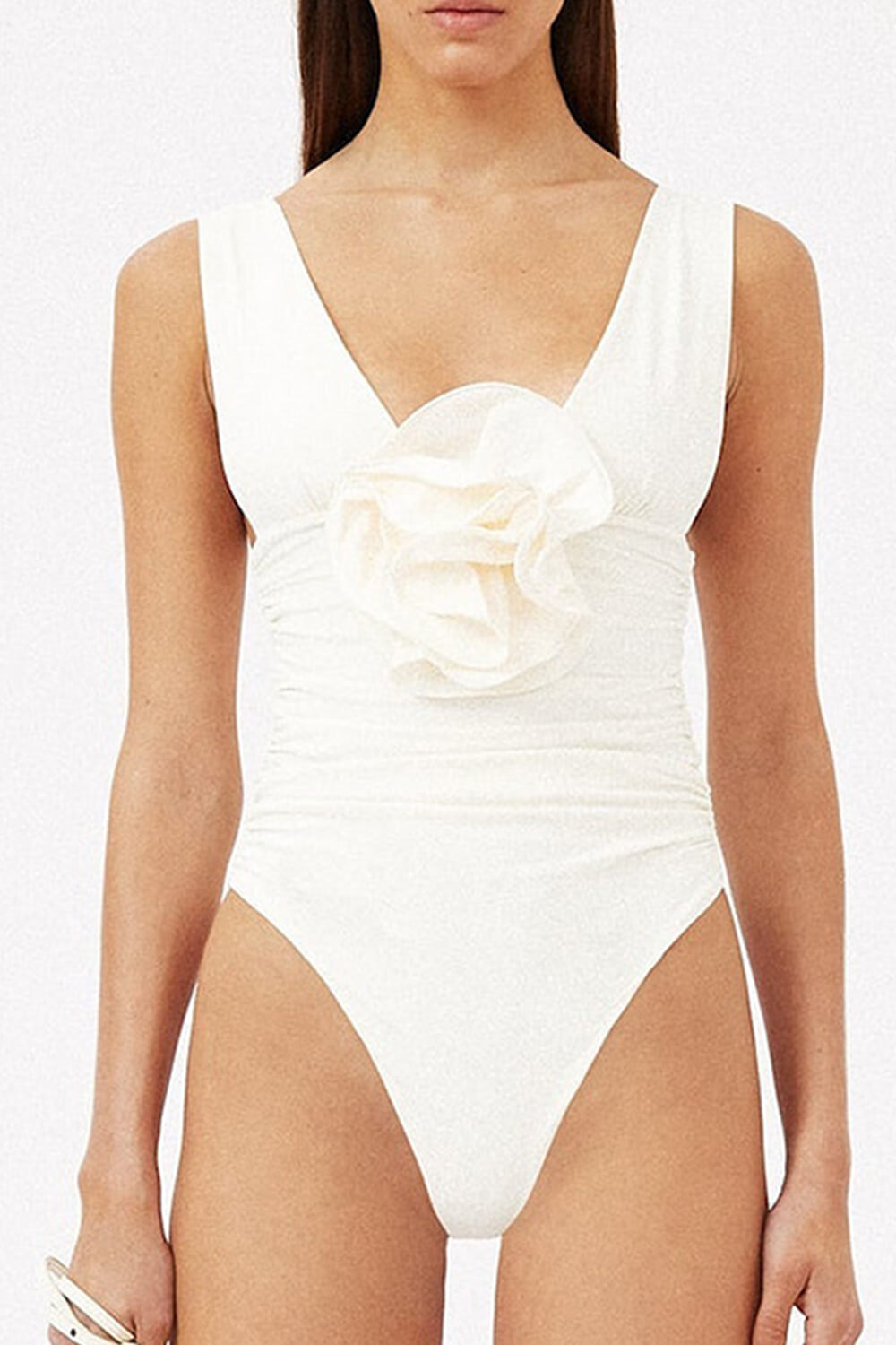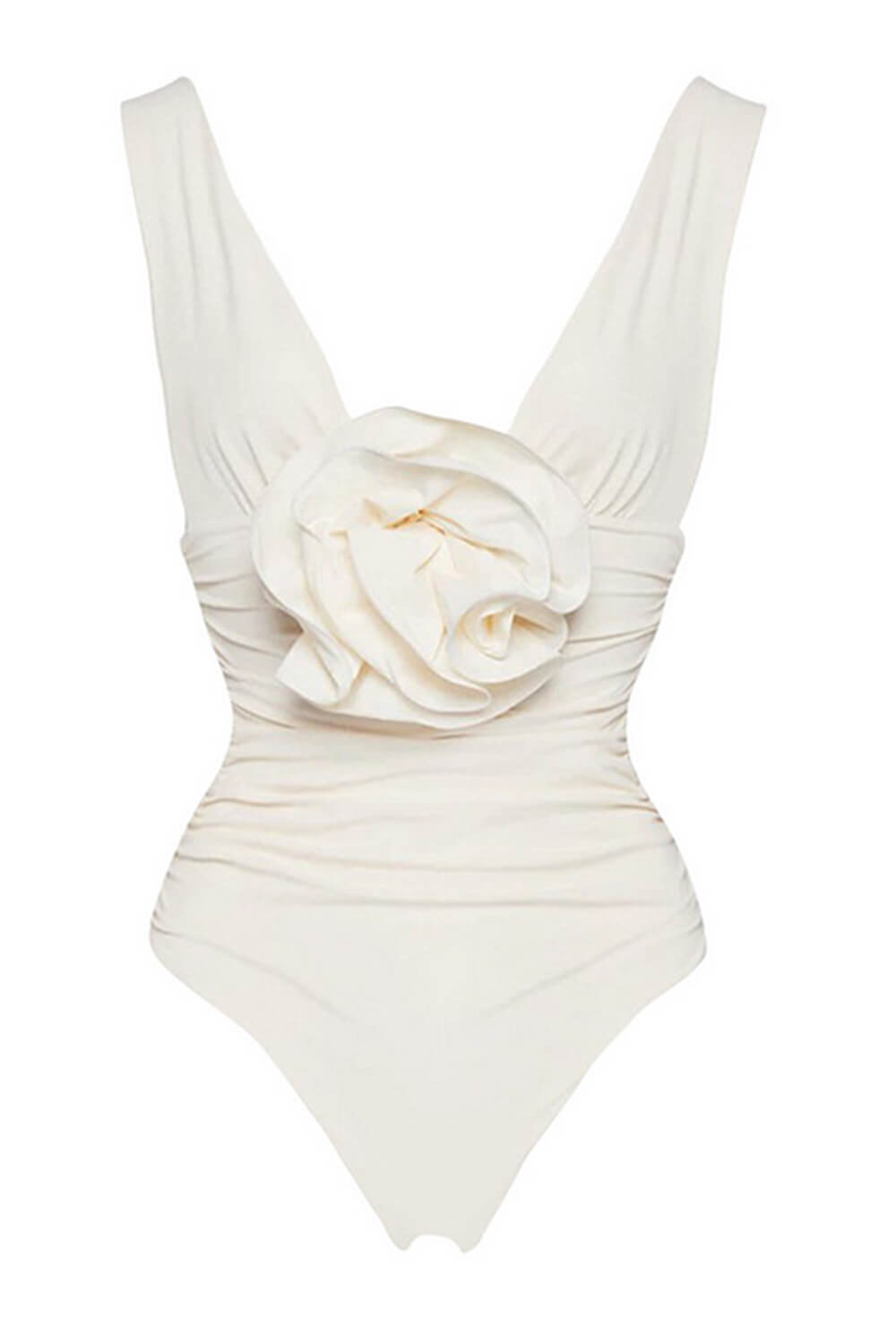 Cream V Neck 3D Flower Ruched One Piece Swimsuit
