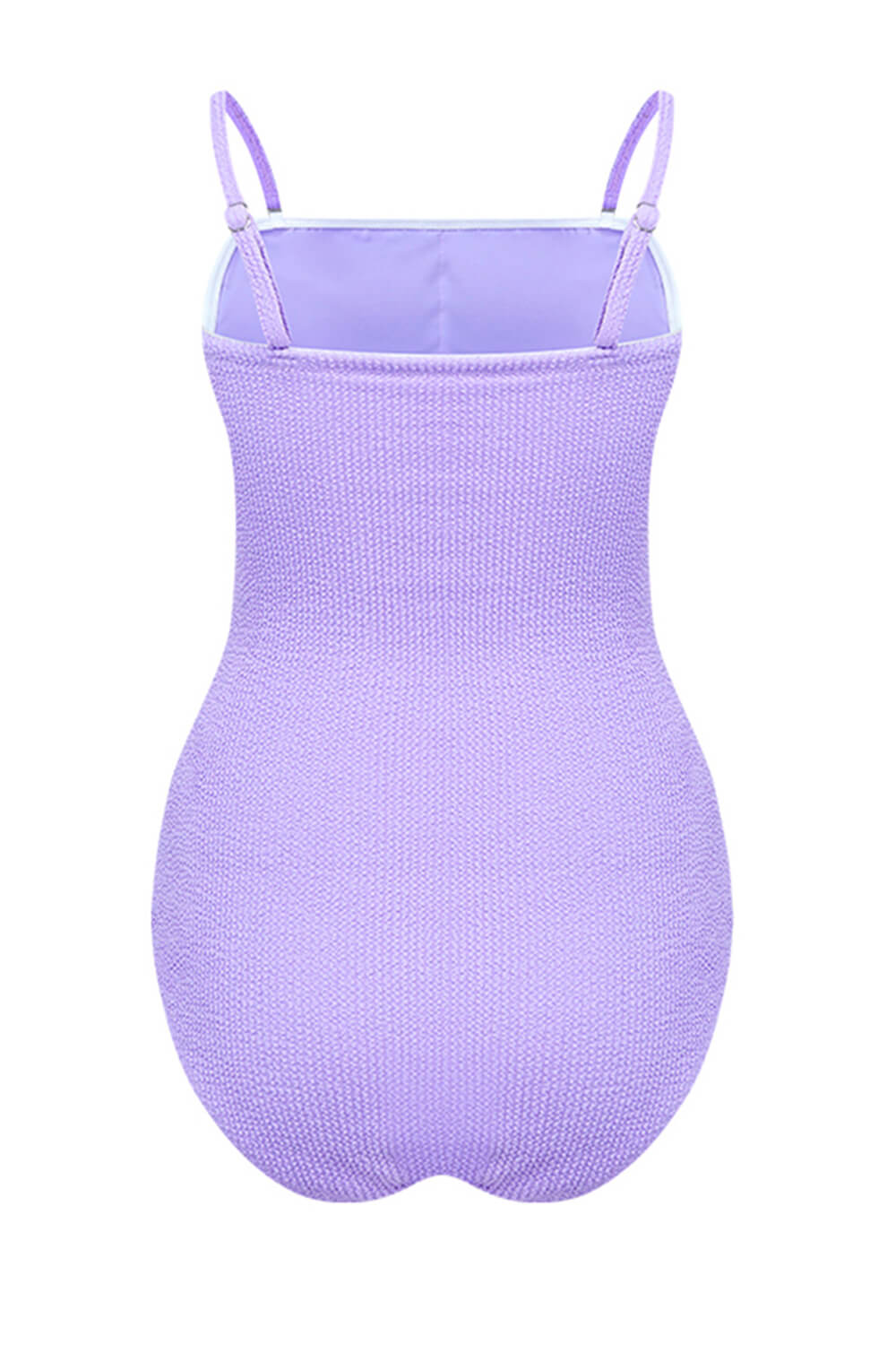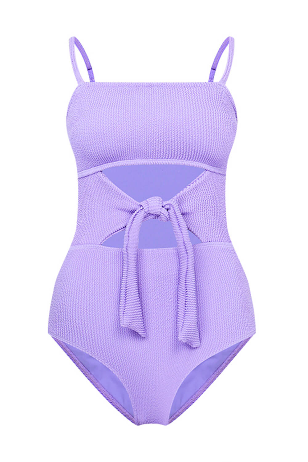 Crinkle Cut-Out Tie Front One Piece Swimsuit - Lilac
