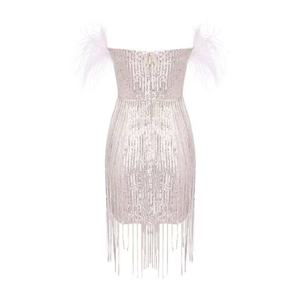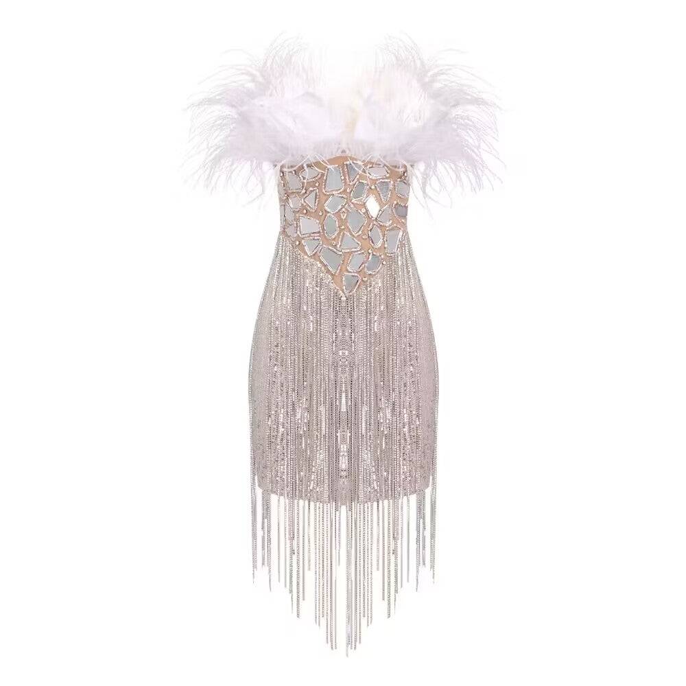 Elevate your style with the Gweneth Feather Sleeveless Rhinestone Tassel Mini Dress �a breathtaking fusion of feathers. rhinestones. and playful tassels. This dress isn't just an outfit; it's a statement of bold and glamorous fashion. Embrace the feathered elegance. rhinestone allure. and playful tassels. expressing your unique sense of style with confidence and flair. Whether you're attending a red carpet event or a special celebration. the Gweneth dress ensures you make a memorable entrance with grace and glamour.