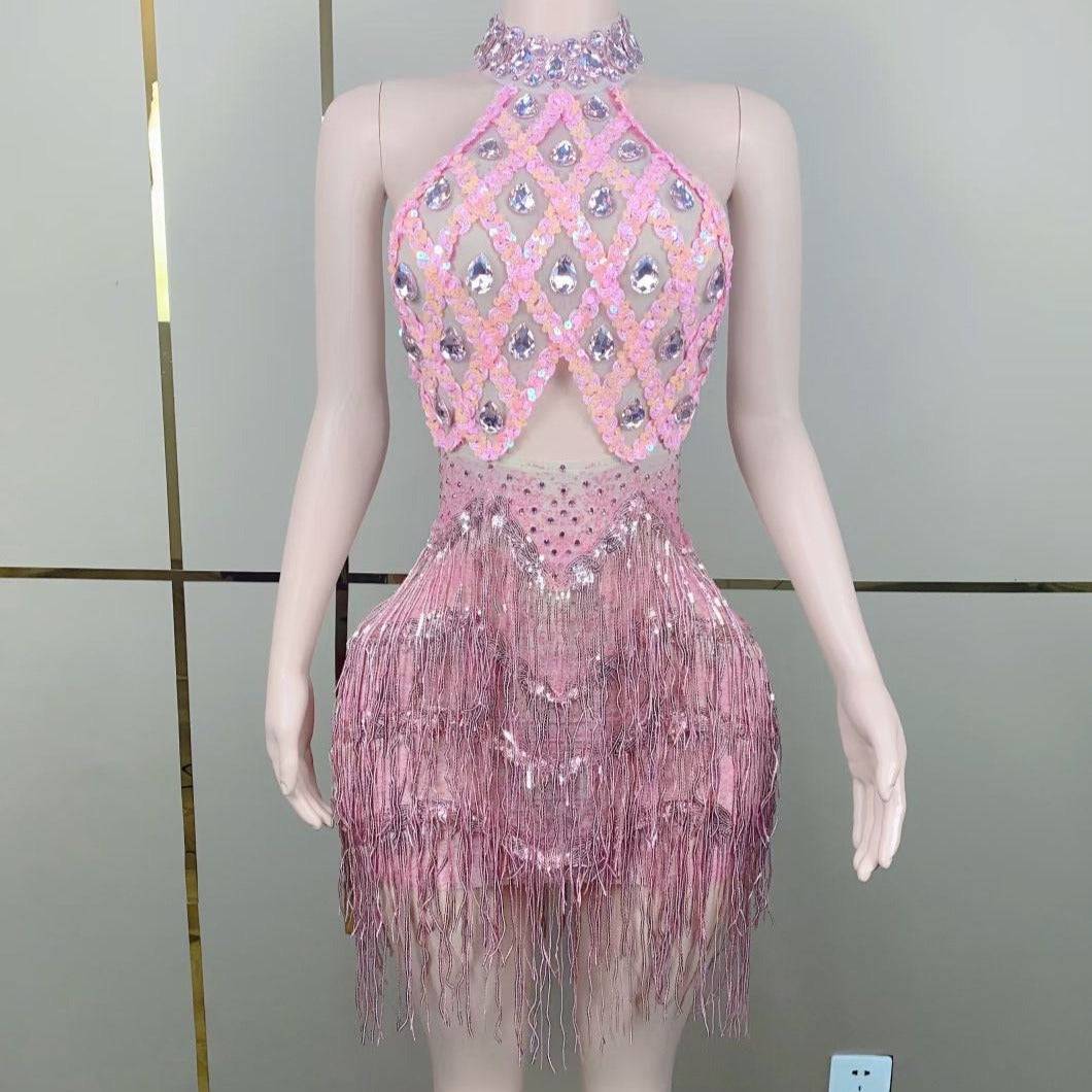 - Despite its bold design. the Heath Sleeveless Sparkly Rhinestone Fringe Mini Dress offers versatile styling options.