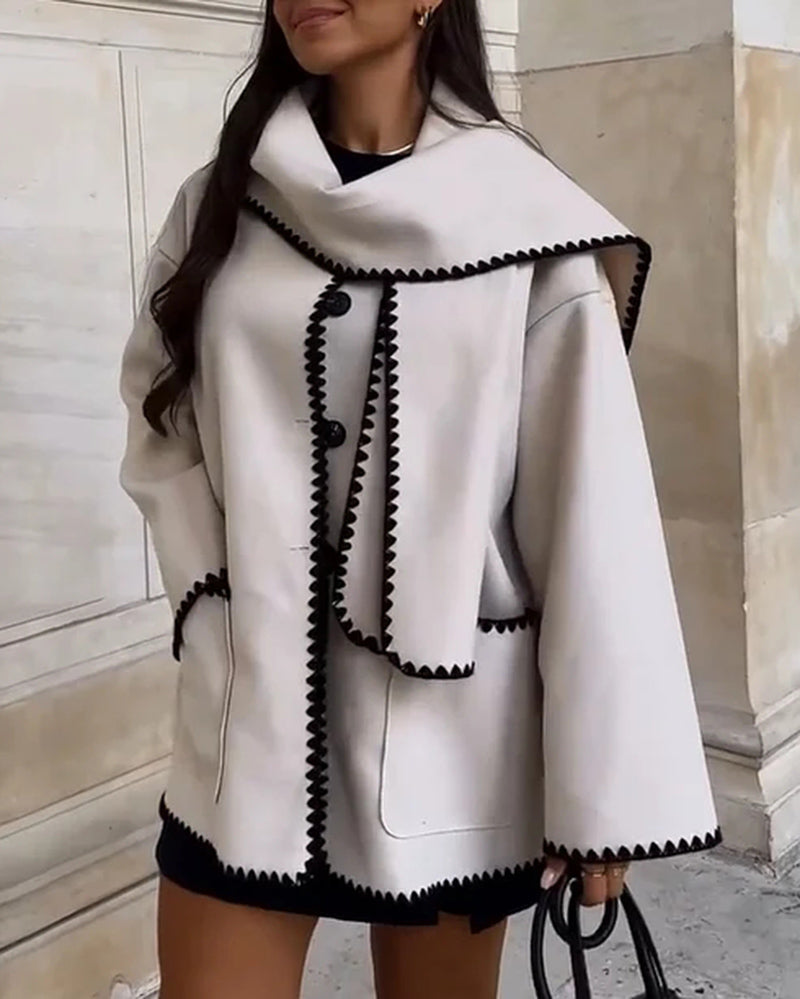 The fringed scarf adds a trendy and bohemian touch. allowing for versatile styling options. Elevate your winter wardrobe with this fashionable woolen coat and its accompanying fringed scarf.