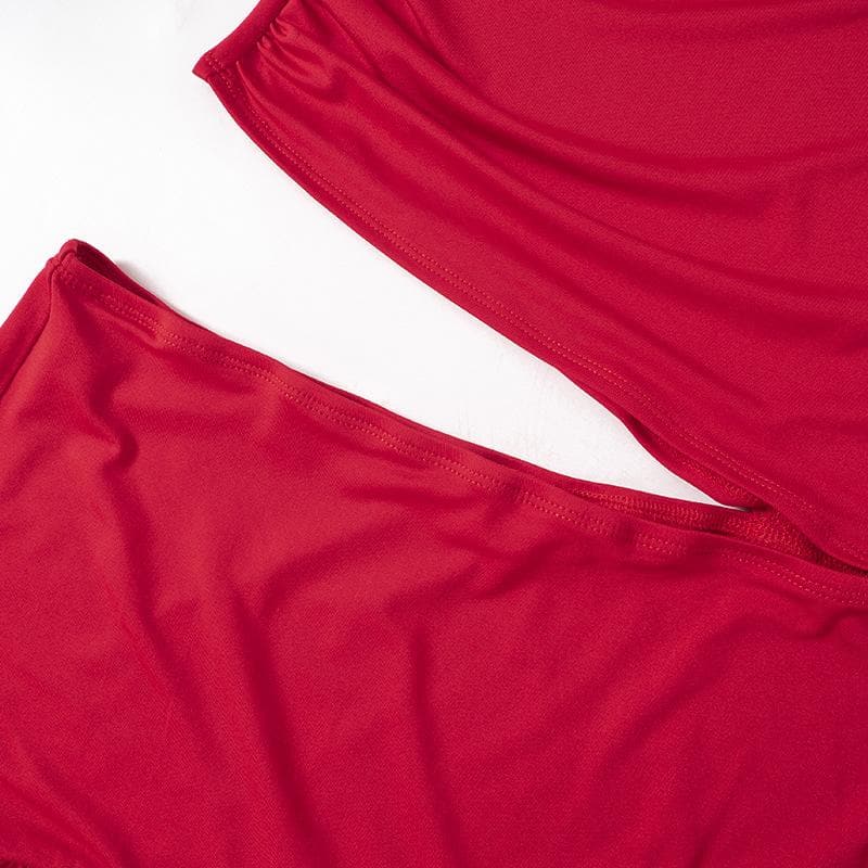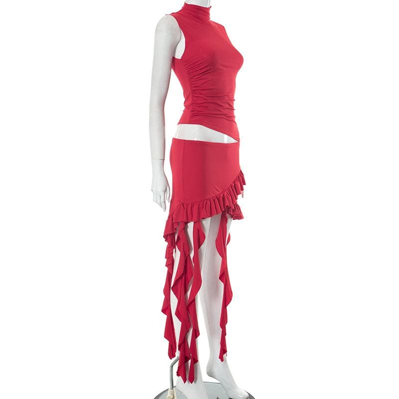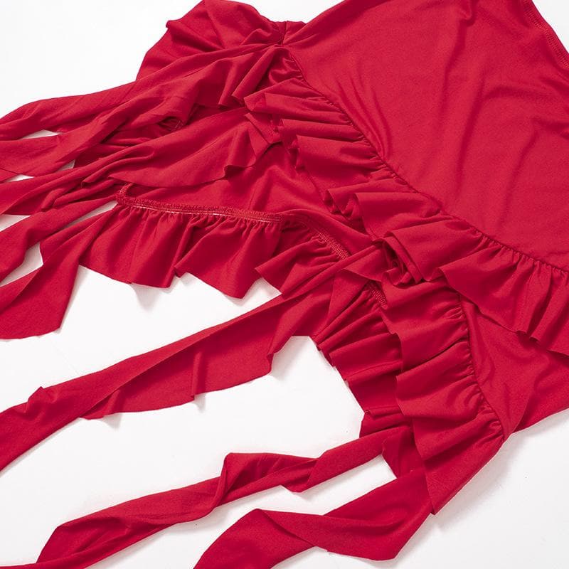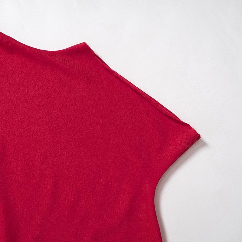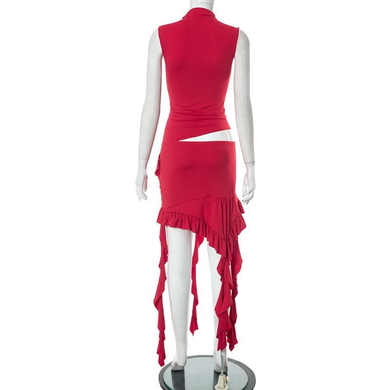 Hollow out irregular ribbon sleeveless high neck mini dress