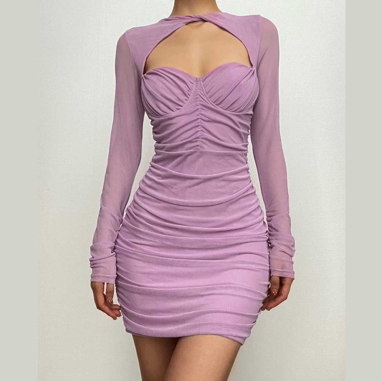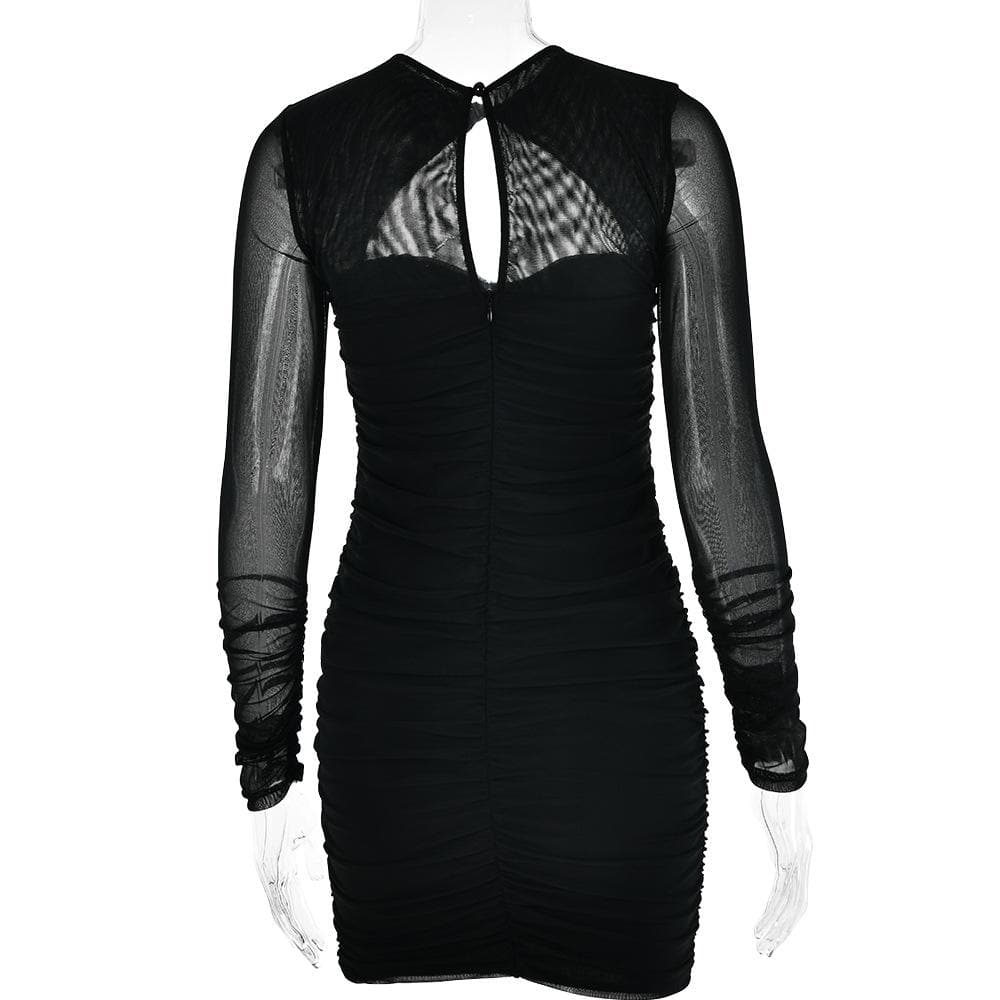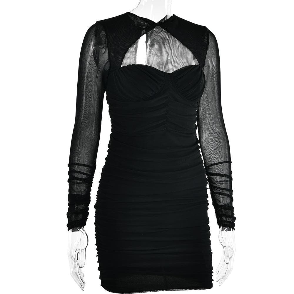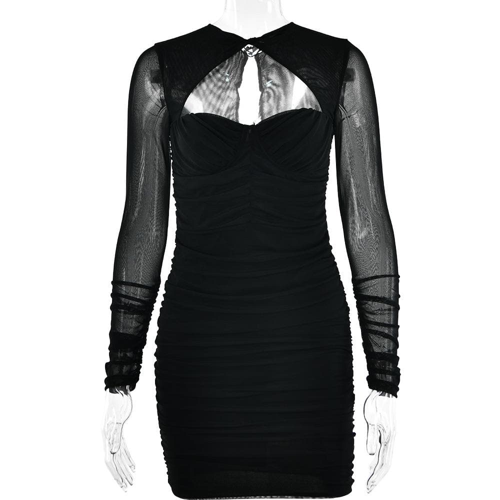 Hollow out ruched mesh long sleeve zip-up button mini dress