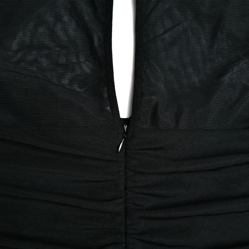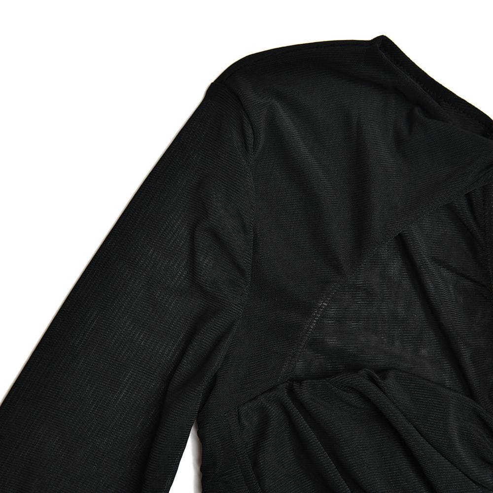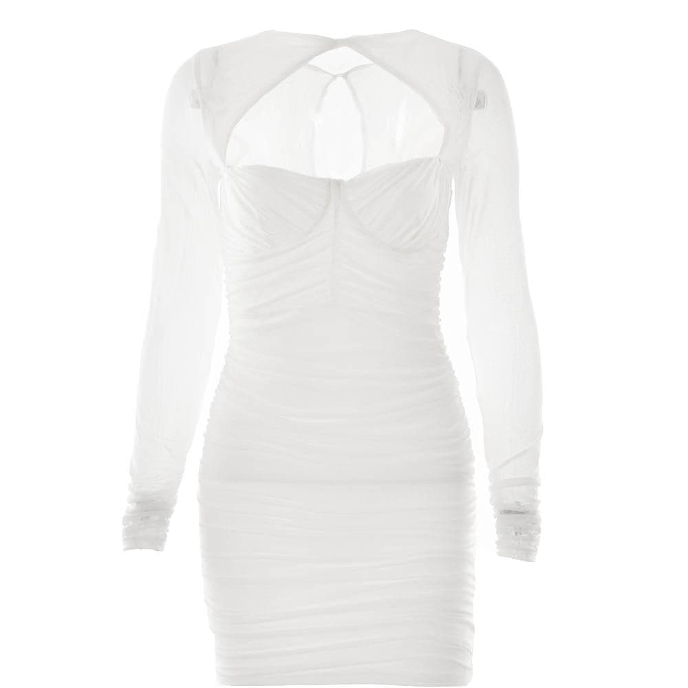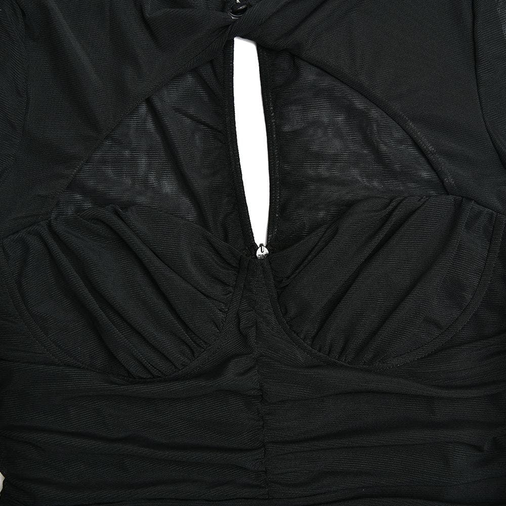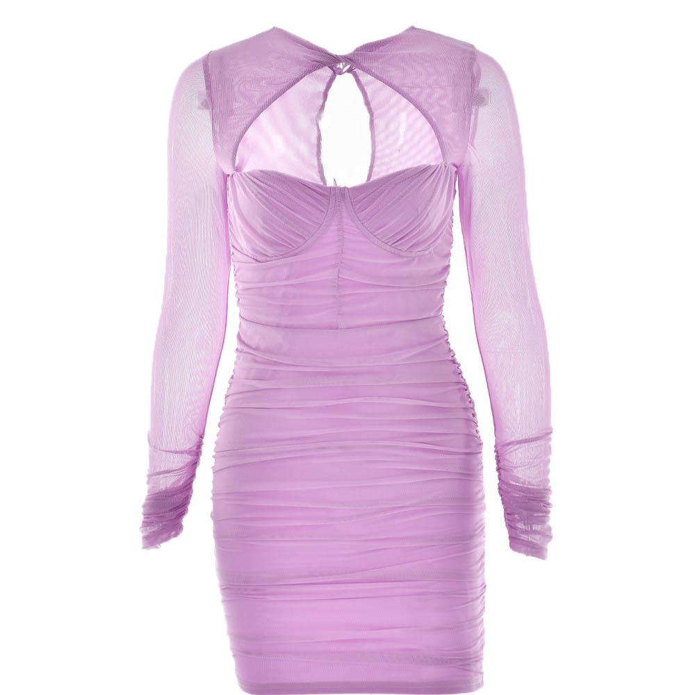 Hollow out ruched mesh long sleeve zip-up button mini dress