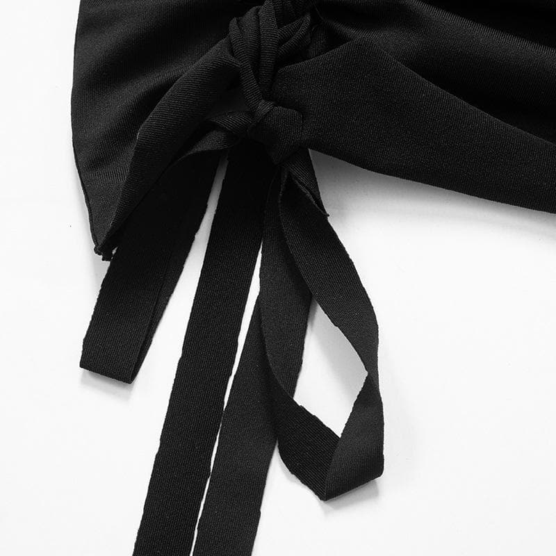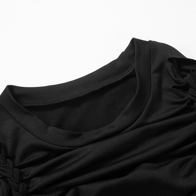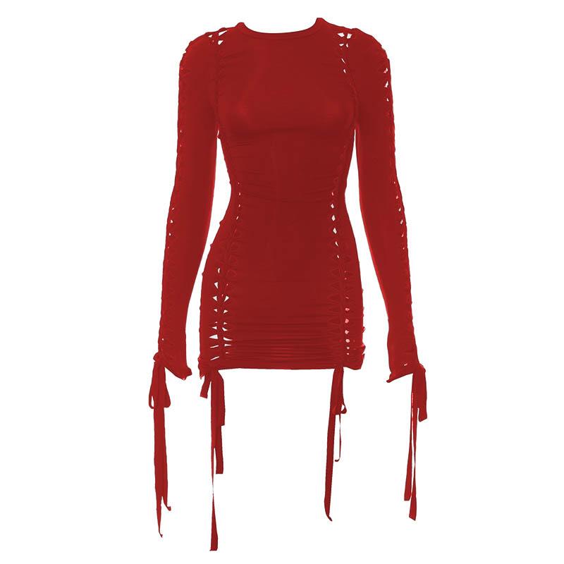 Hollow out self tie long sleeve solid crewneck mini dress