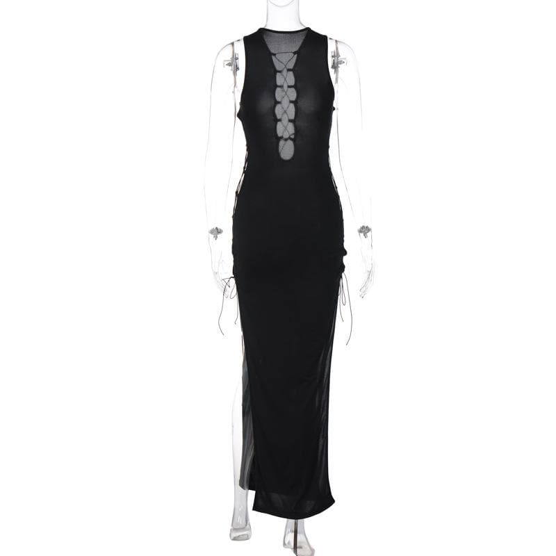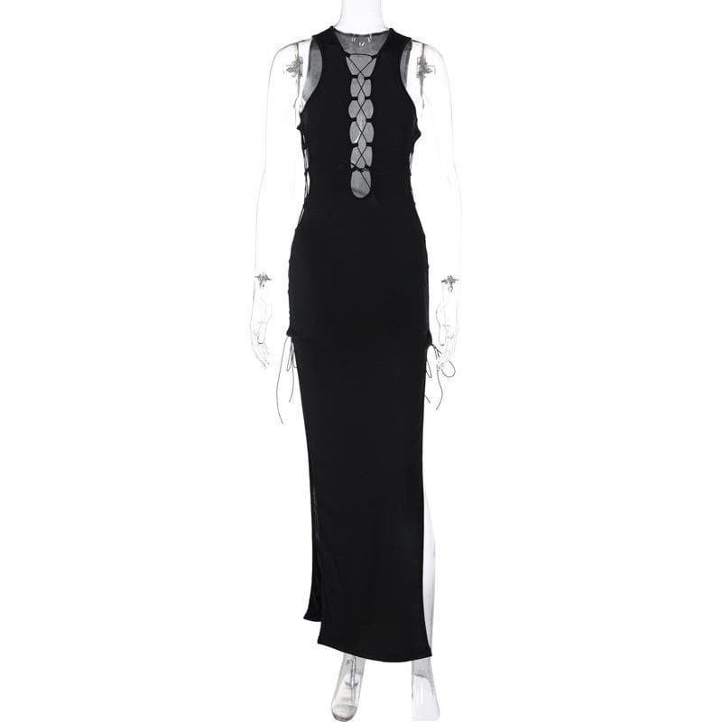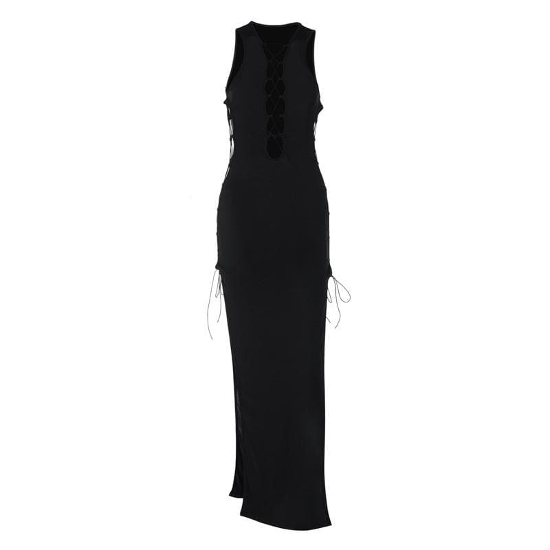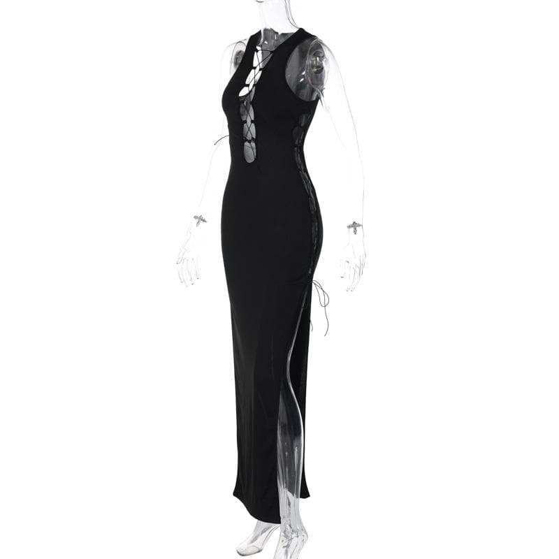 Hollow out sleeveless lace up slit solid maxi dress