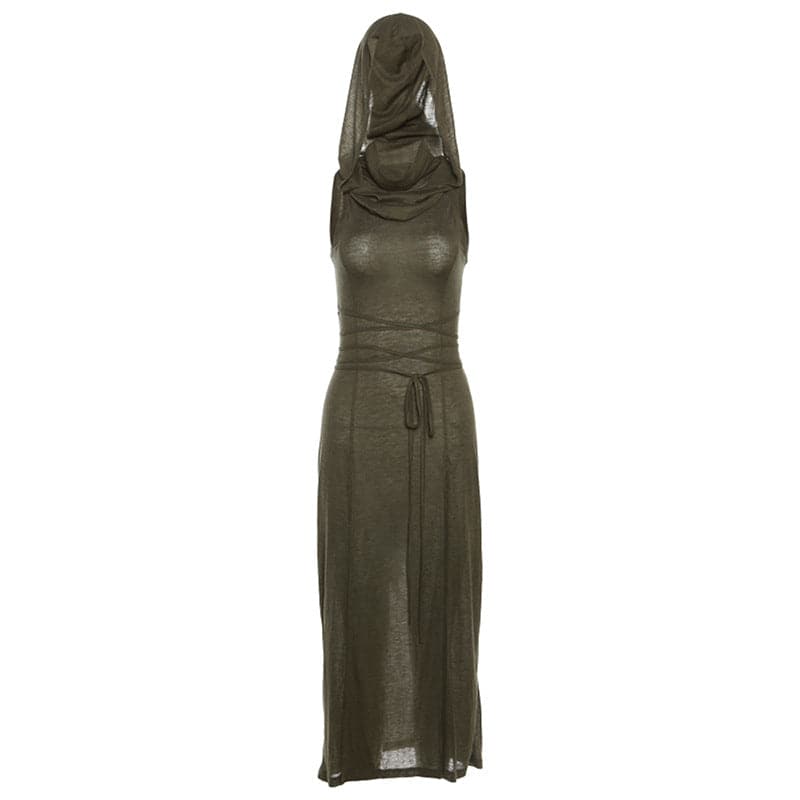 Hoodie sleeveless slit hollow out self tie cowl neck maxi dress