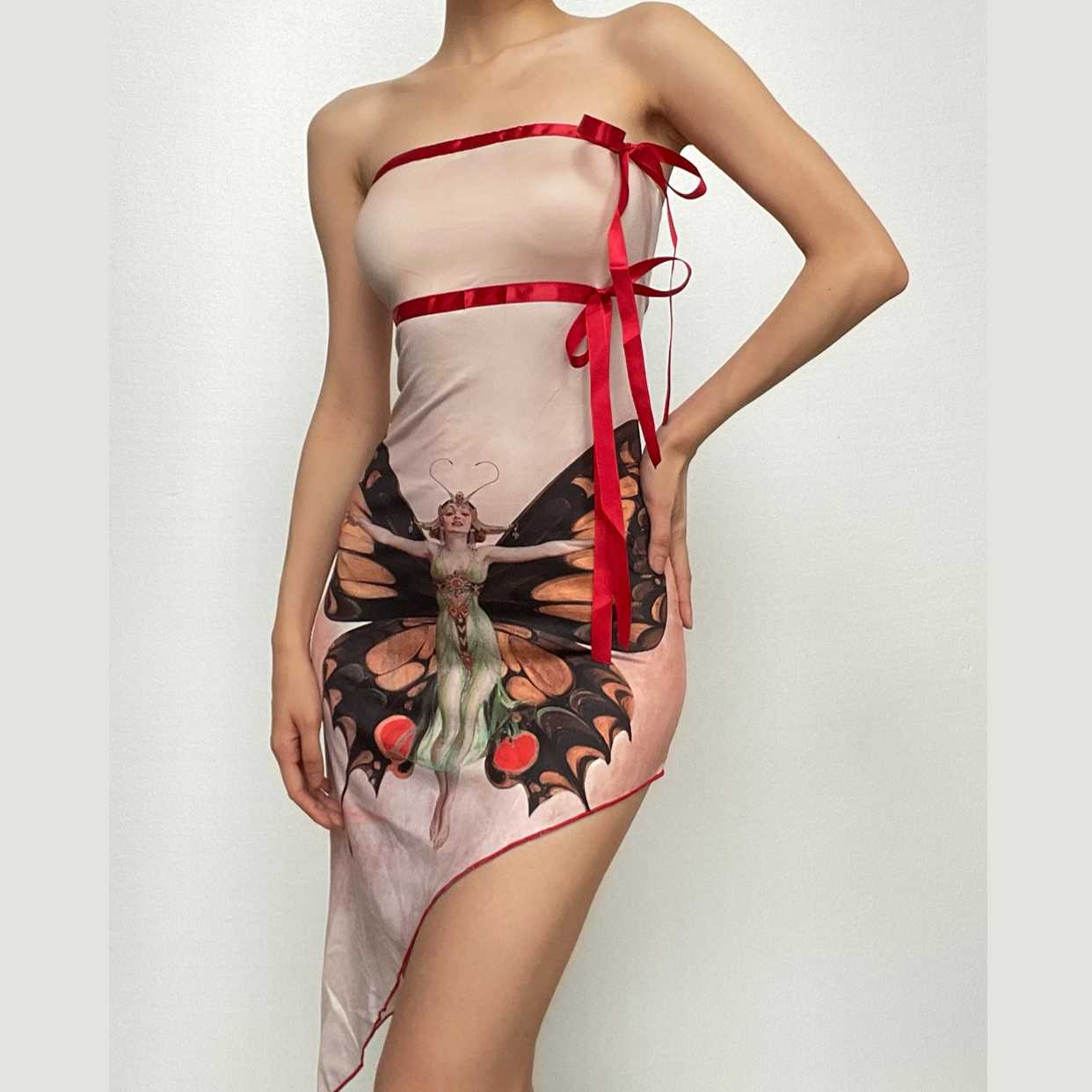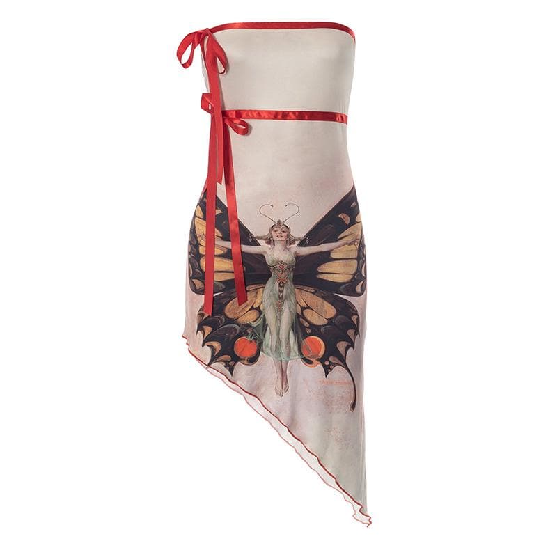 Irregular ruffle butterfly pattern contrast tube mini dress