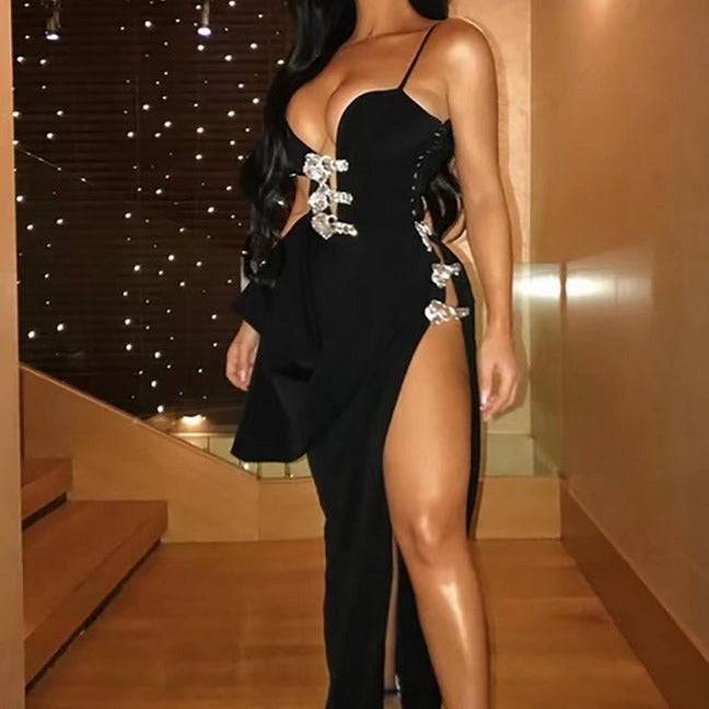 - The dress features a chic maxi length. offering a sophisticated and versatile style.